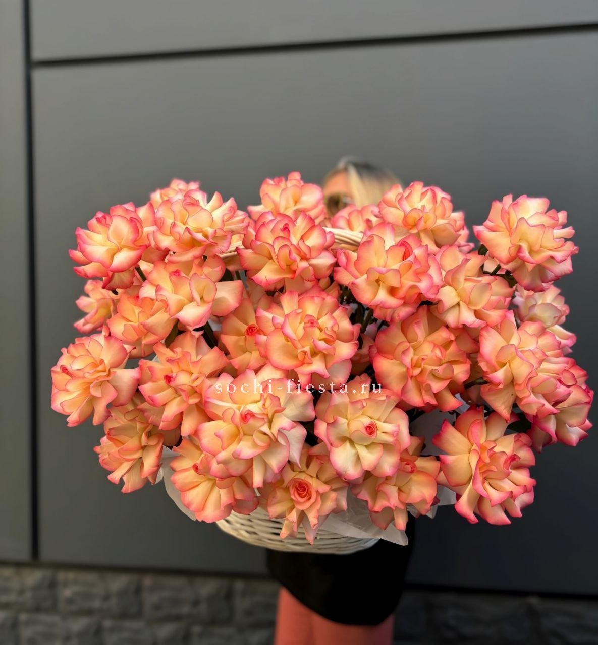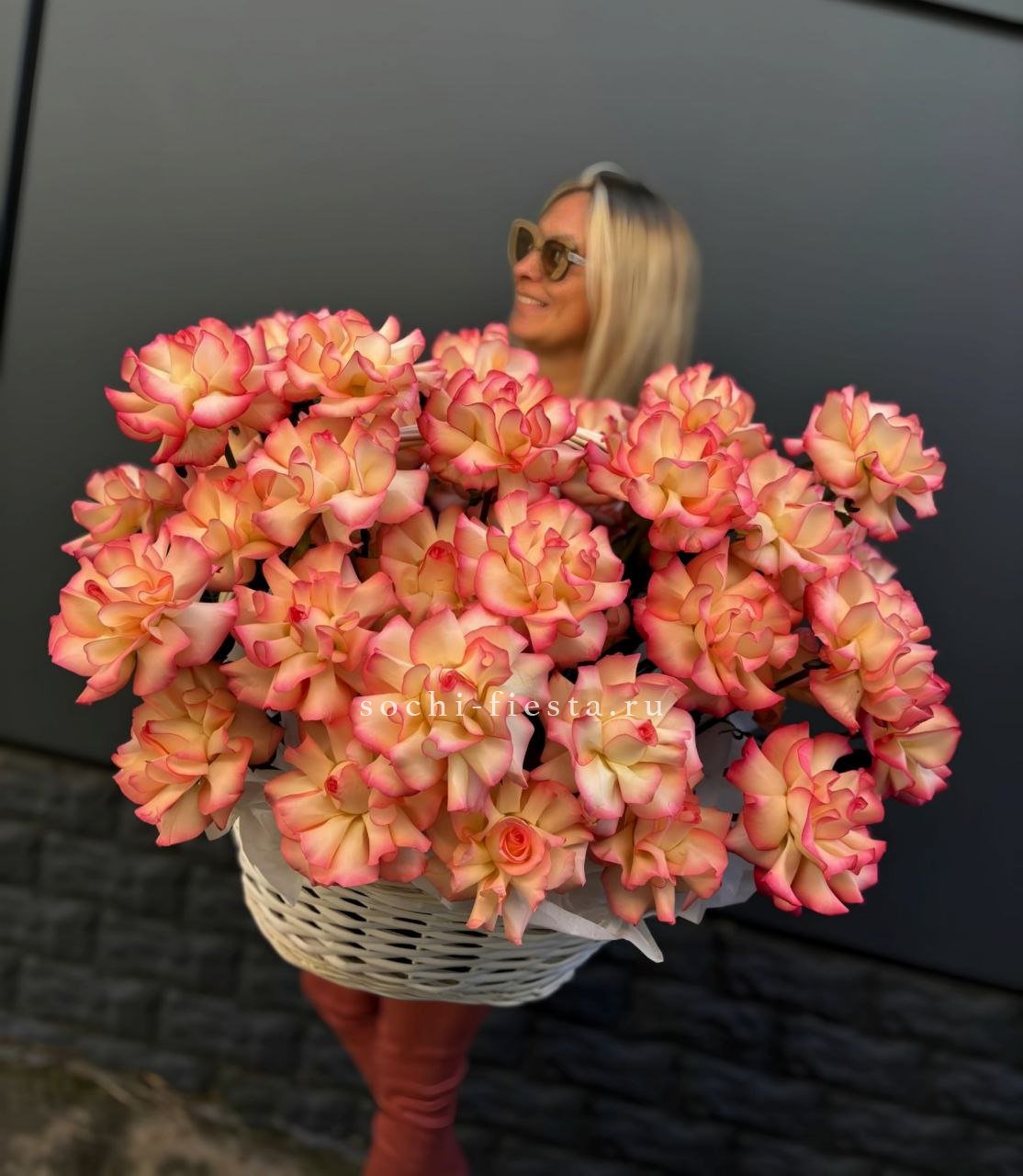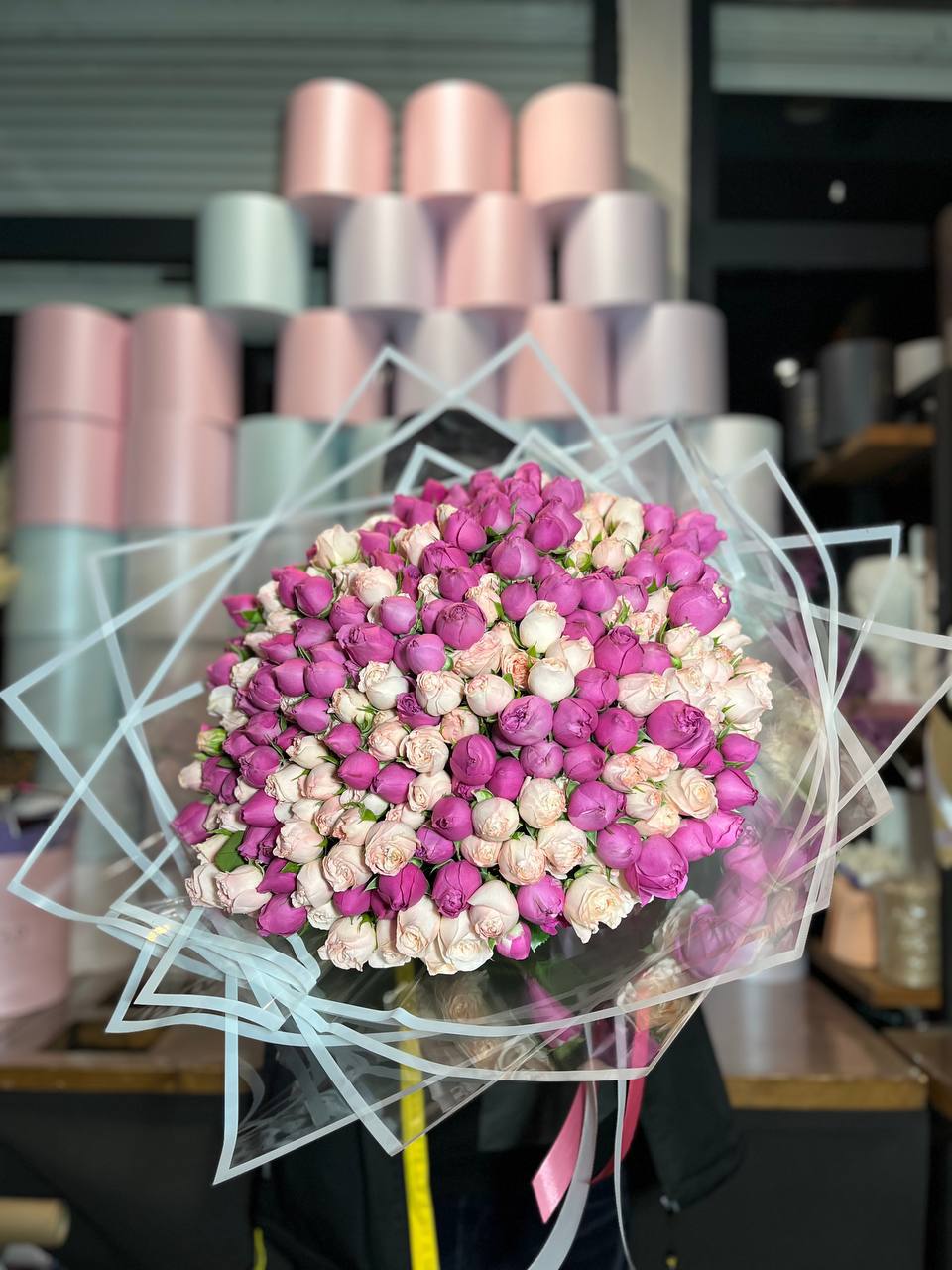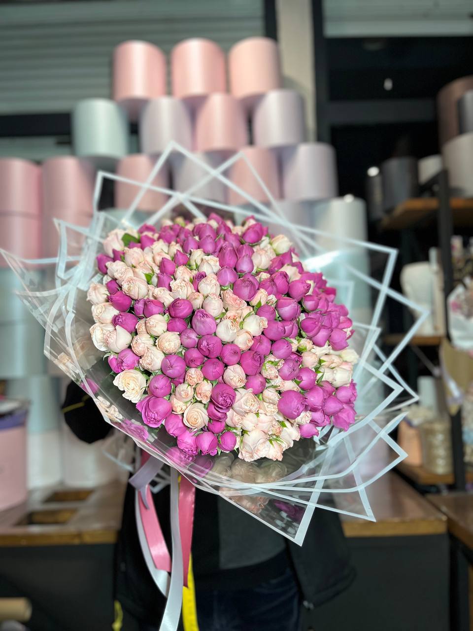Масштабная композиция из ста одной кустовой пионовидной розы занимает всё внимание. Множество бутонов с волнистыми лепестками создают живую фактуру и впечатляющее присутствие в любом пространстве.
