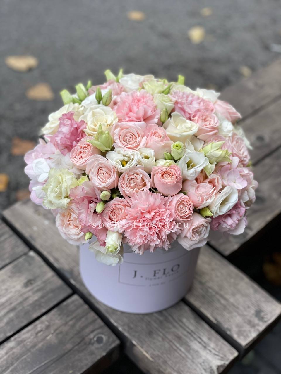 Сто один бутон кенийского пионовидного сорта собраны в масштабную композицию. Белая окантовка лепестков переходит в розовый центр. Впечатляющее присутствие в любом пространстве.