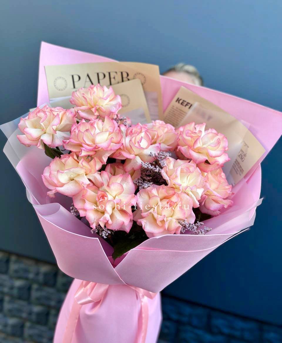 15 роз сорта джумилия, лента, дизайнерская упаковка.
