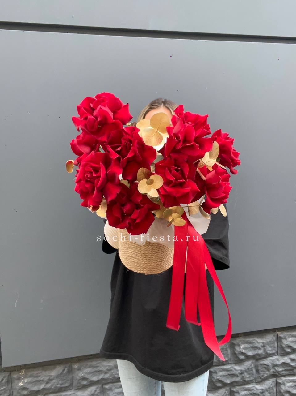 Двести одна роза глубокого красного оттенка собрана в просторной корзине. Плотное заполнение создает цельную бархатистую поверхность, где каждый бутон дополняет соседний. Масштабная композиция для выражения самых сильных чувств.