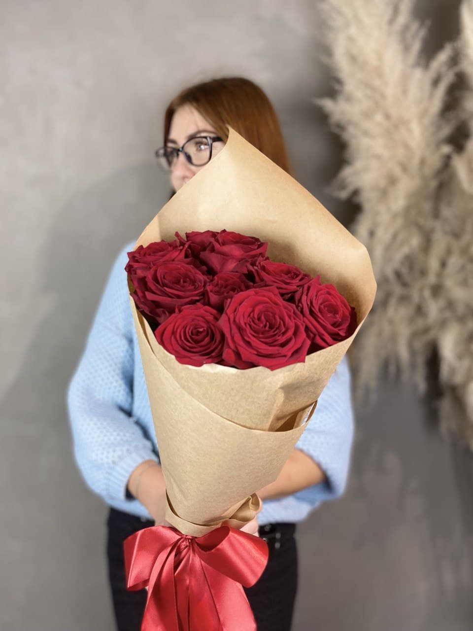 Пятьдесят пять бутонов собраны в плотную округлую форму, где каждый цветок читается отдельно. Красный здесь звучит насыщенно и глубоко, создавая мощное визуальное присутствие. Букет держит форму и занимает пространство уверенно.