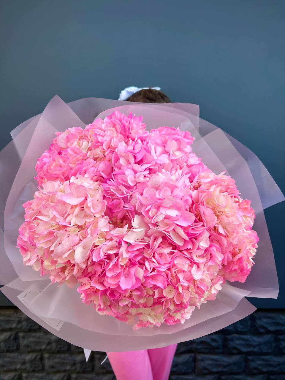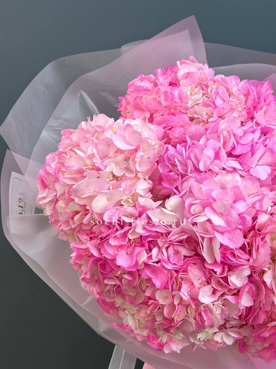Девять ярких соцветий гортензии насыщенного розового цвета. Каждая шапка раскрыта полностью, создавая плотную текстуру и глубокий оттенок, который не оставит равнодушным.