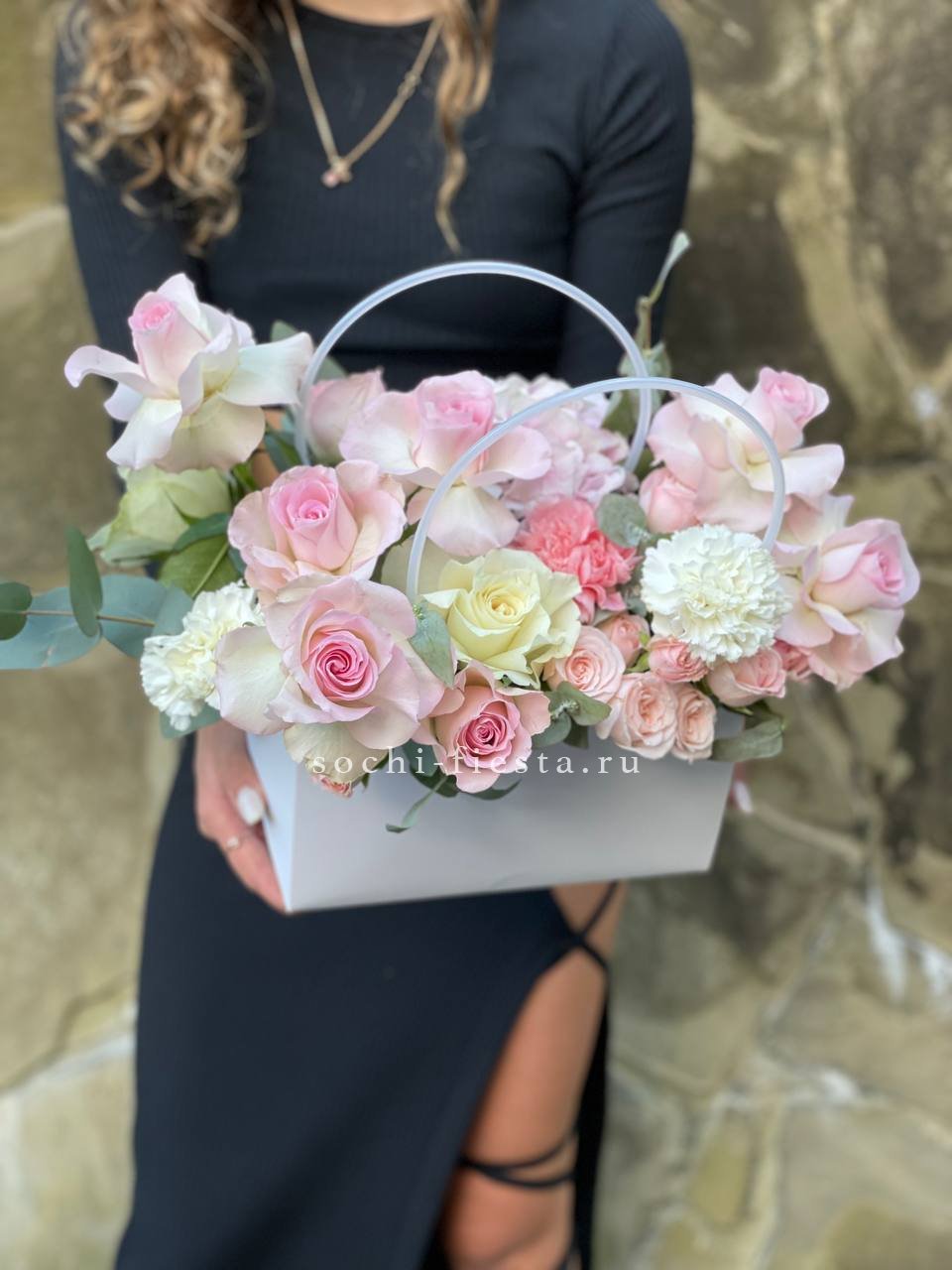 гортензия, кустовые розы, розы, лимониум, эвкалипт, лента, корзина D40.
