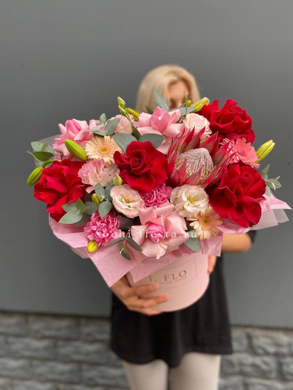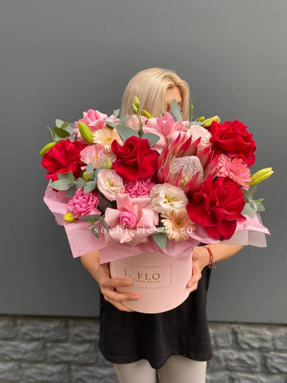 Крупные соцветия гортензии и экзотичные протеи создают плотную текстуру с глубокими переходами оттенков. Антуриумы и пионовидные розы добавляют объёма, а веточки илекса и хамелациума разбивают композицию лёгкими штрихами зелени.