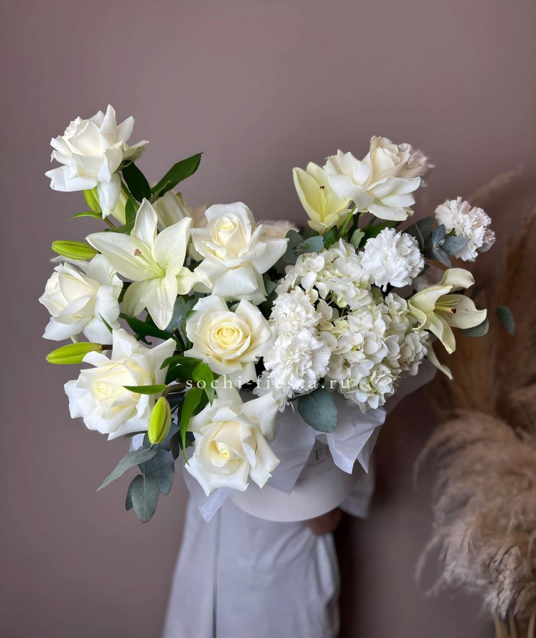 гортензия, эустомы, кустовые розы, одноголовая роза, эвкалипт, вспомогательные цветы (зависит от сезона), тишью, лента, авторская упаковка.