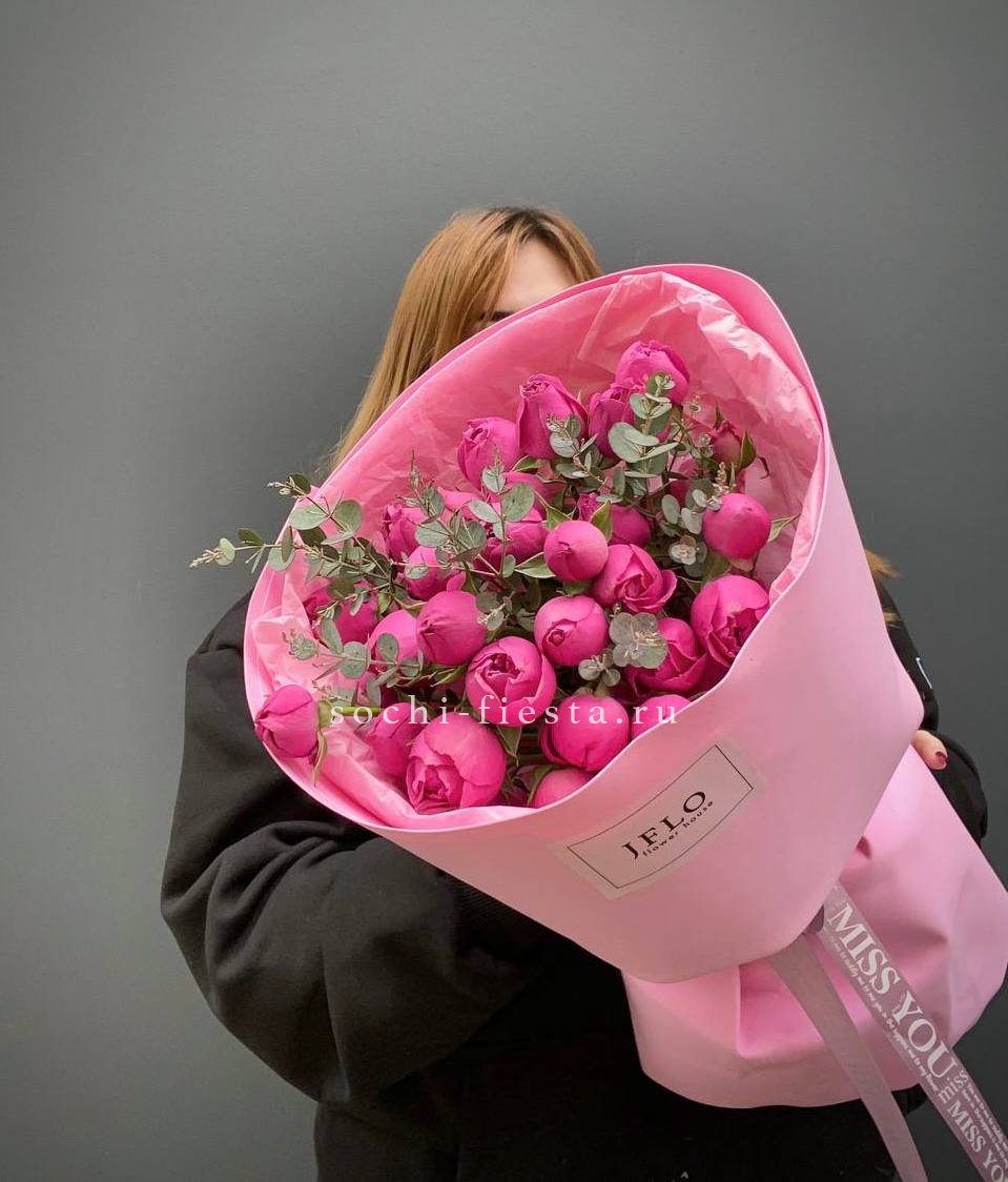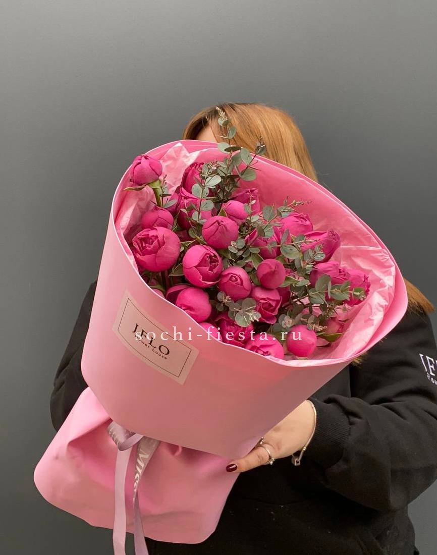 пионы, эвкалипт, лента и дизайнерская пленка.