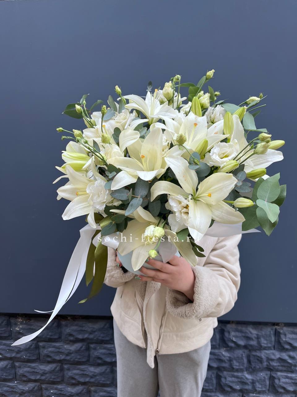 Сочетание пышной голубой гортензии и классических белых роз — это гимн нежности и чистоты. Букет, который не просто удивляет своим масштабом, но и дарит ощущение безмятежности. Идеальный выбор для самого искреннего признания.
