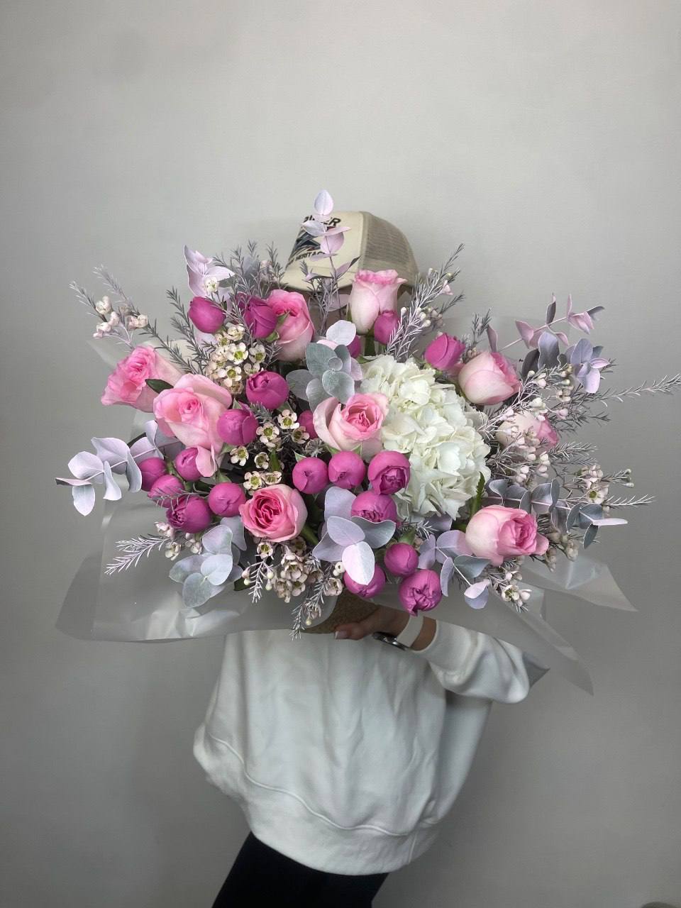 Махровые бутоны Бомбастик с множеством лепестков соседствуют с воздушной эустомой. Разная плотность цветков создаёт визуальную глубину и объём композиции.