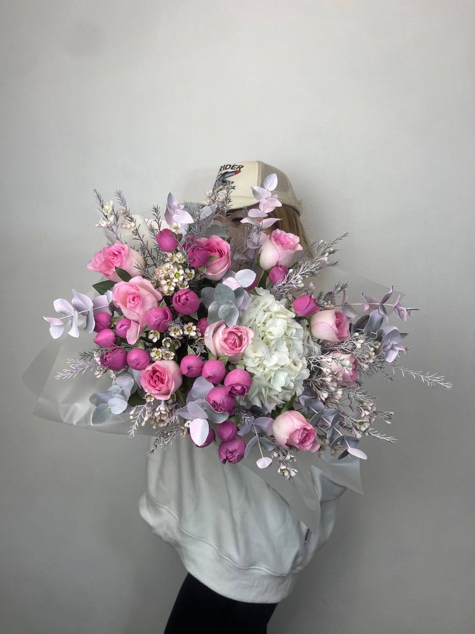 пионовидные розы Бомбастик, эустома, оформление.