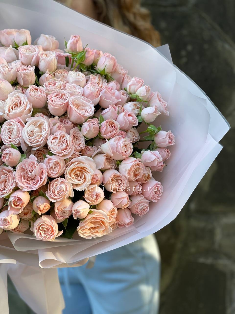 Розовая гамма раскрывается через махровые пионовидные бутоны и классические розы с плотной текстурой лепестков. Эвкалипт вплетается в композицию, создавая свежий акцент.