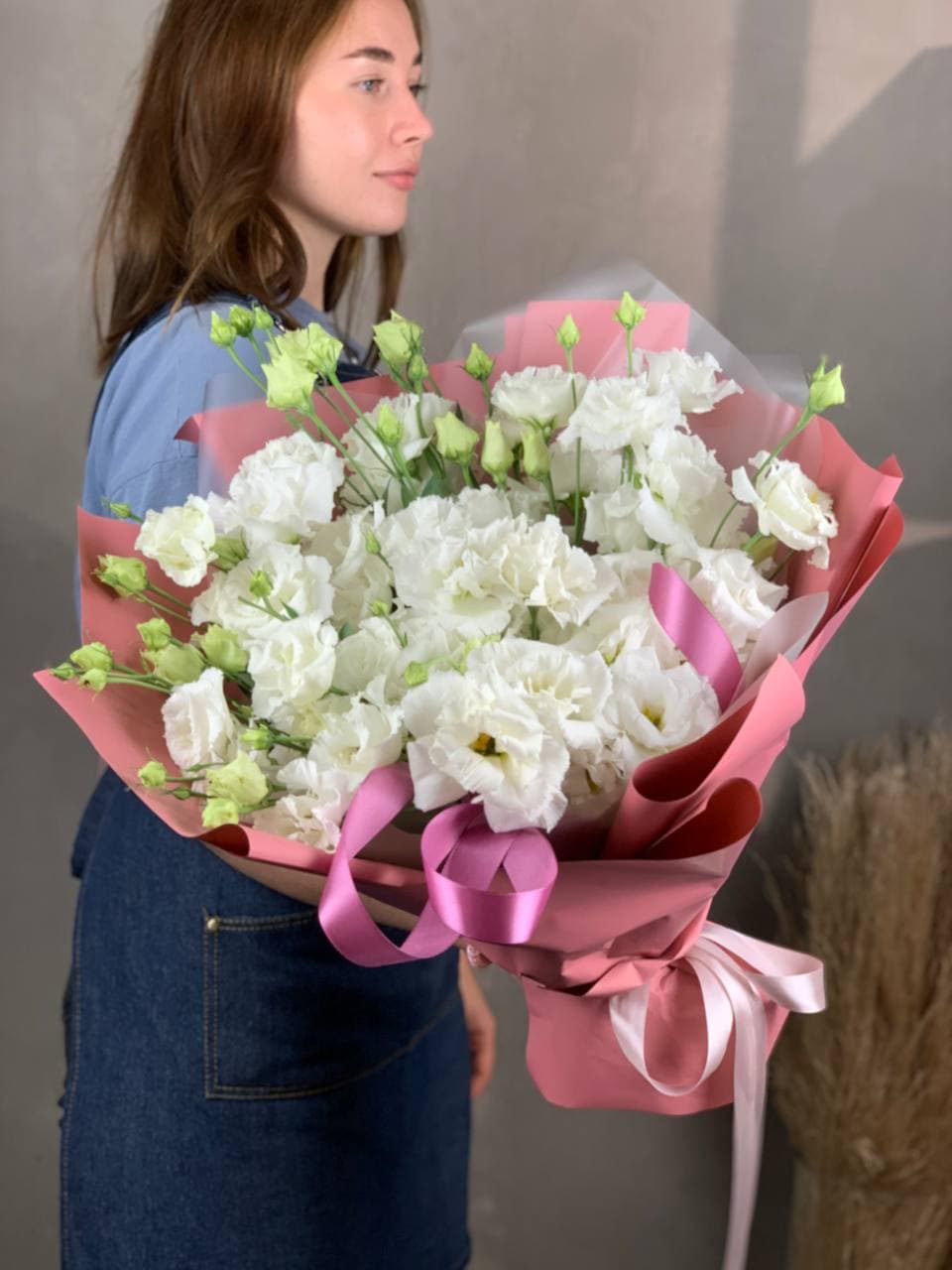 эустома - 21 шт., лента, упаковка фоамиран. Изначальная цена указана за букет Мини эустом- 7 шт.  Стандарт: 21 шт. эустомVIP: 41 шт.