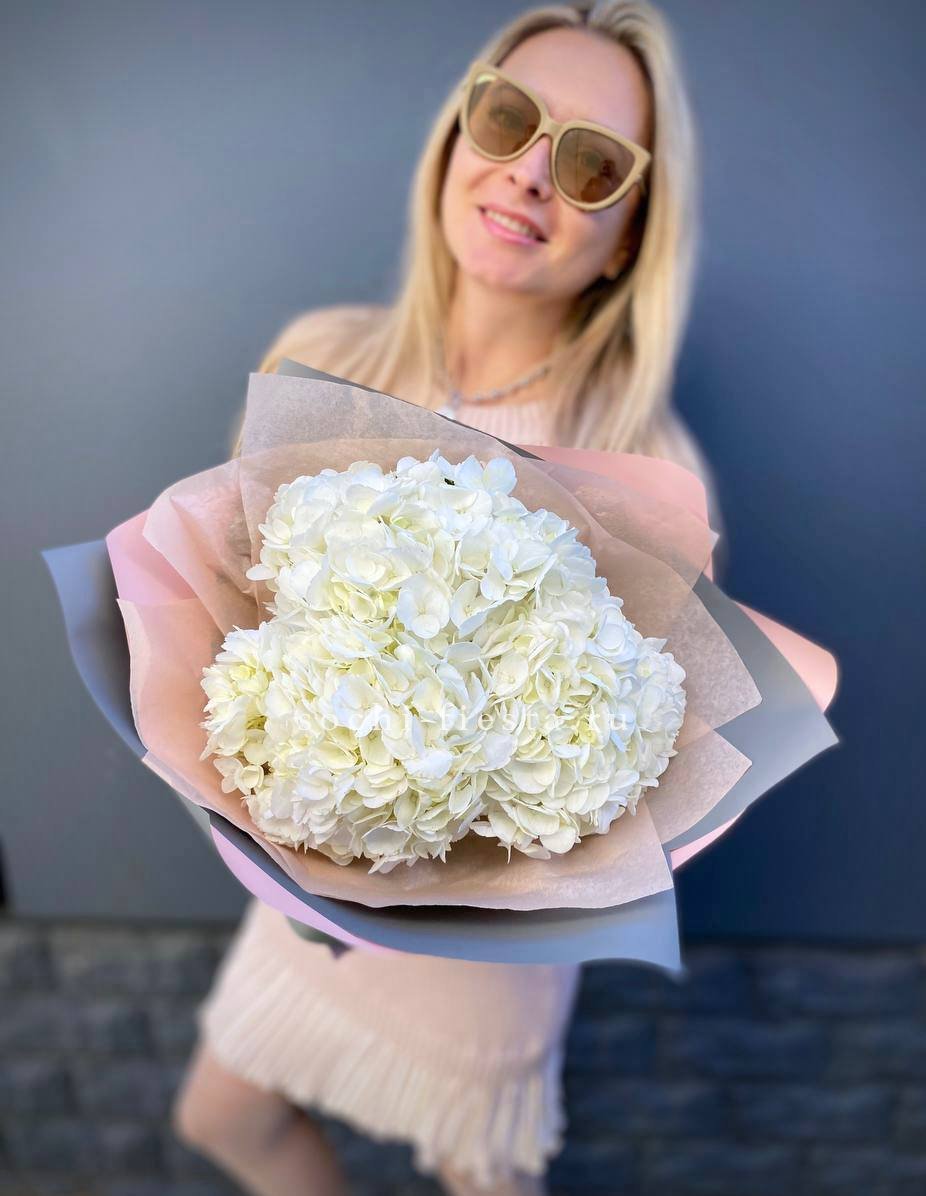 Для заказа товара "Букет из трёх белых гортензий" с доставкой в Волжские нажмите в корзину