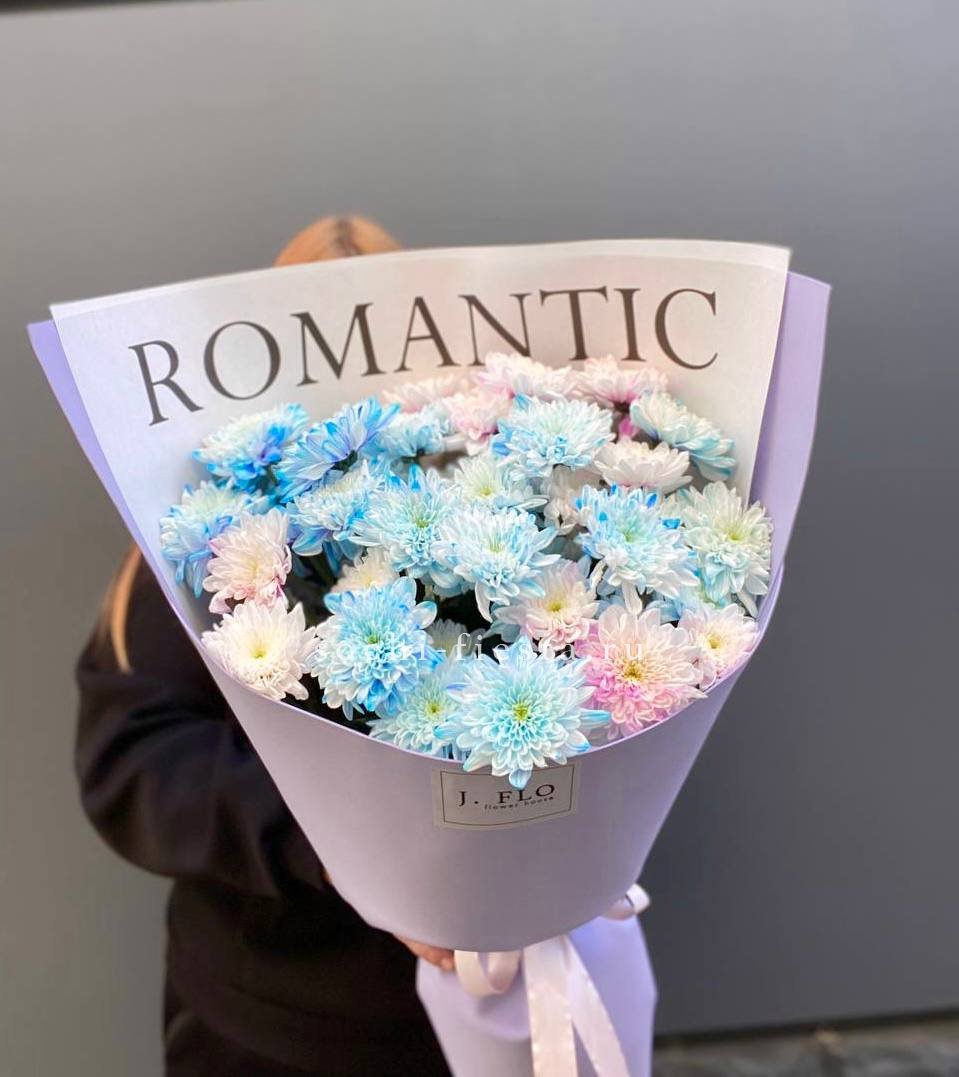 Девять веток кустовых хризантем раскрываются пышной шапкой мелких соцветий. Авторская упаковка добавляет графичности без лишних деталей. Букет держит форму и радует долгим цветением.