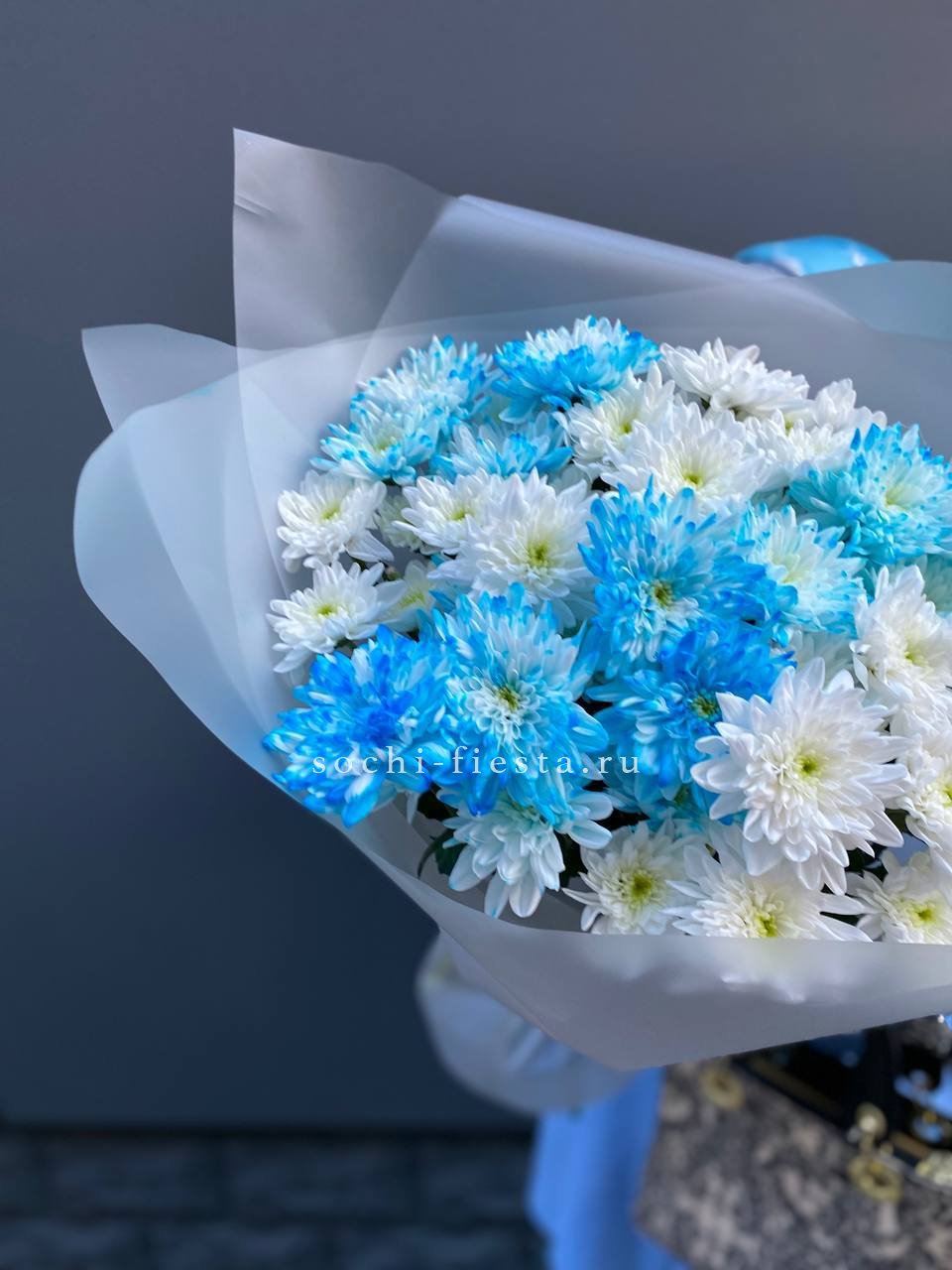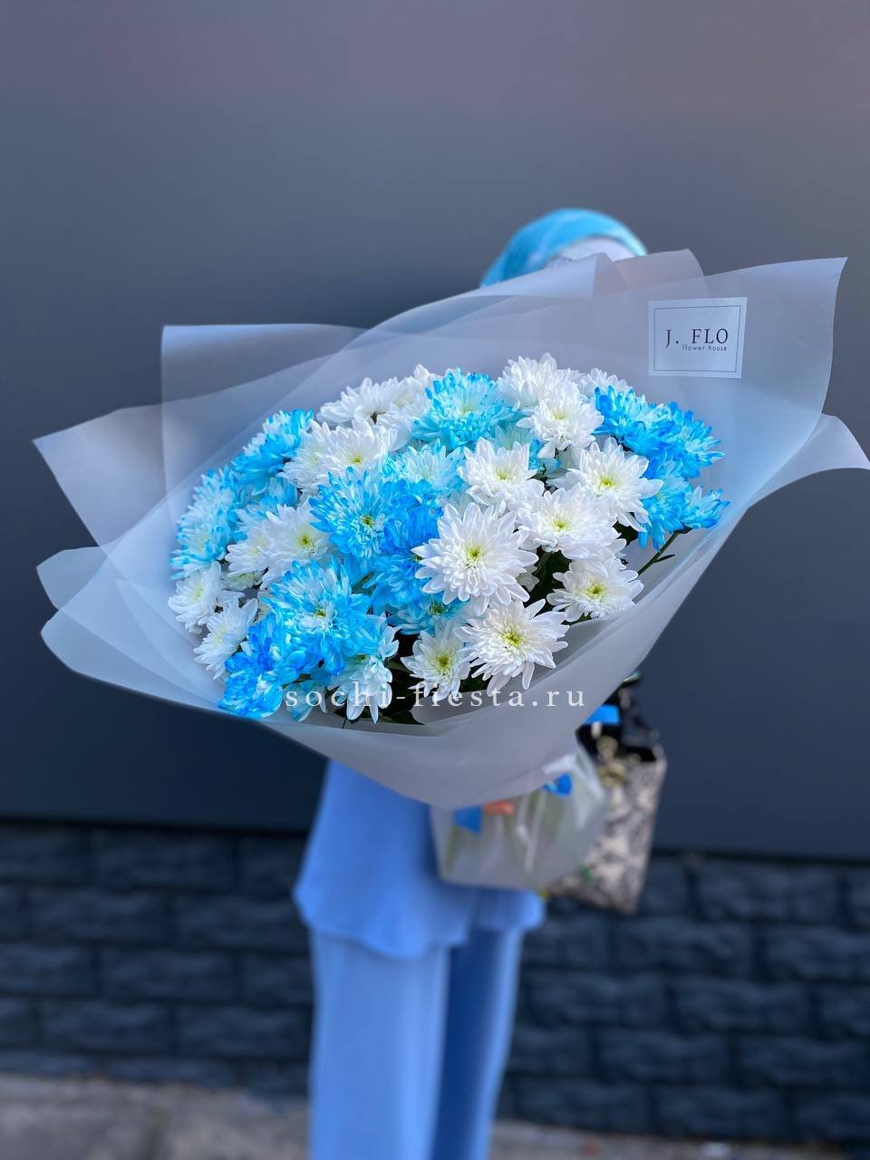 Двадцать одна ветка кустовой хризантемы в естественной подаче без лишнего декора. Простая форма и свежесть соцветий делают композицию универсальной для любого интерьера.