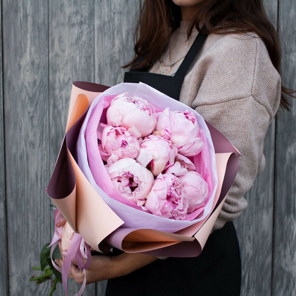 Пионы Сара Бернар раскрываются слоями густых лепестков с волнистыми краями. Розовая гамма мягко переходит от светлых до глубоких тонов. Семь бутонов дополнены дизайнерской упаковкой.