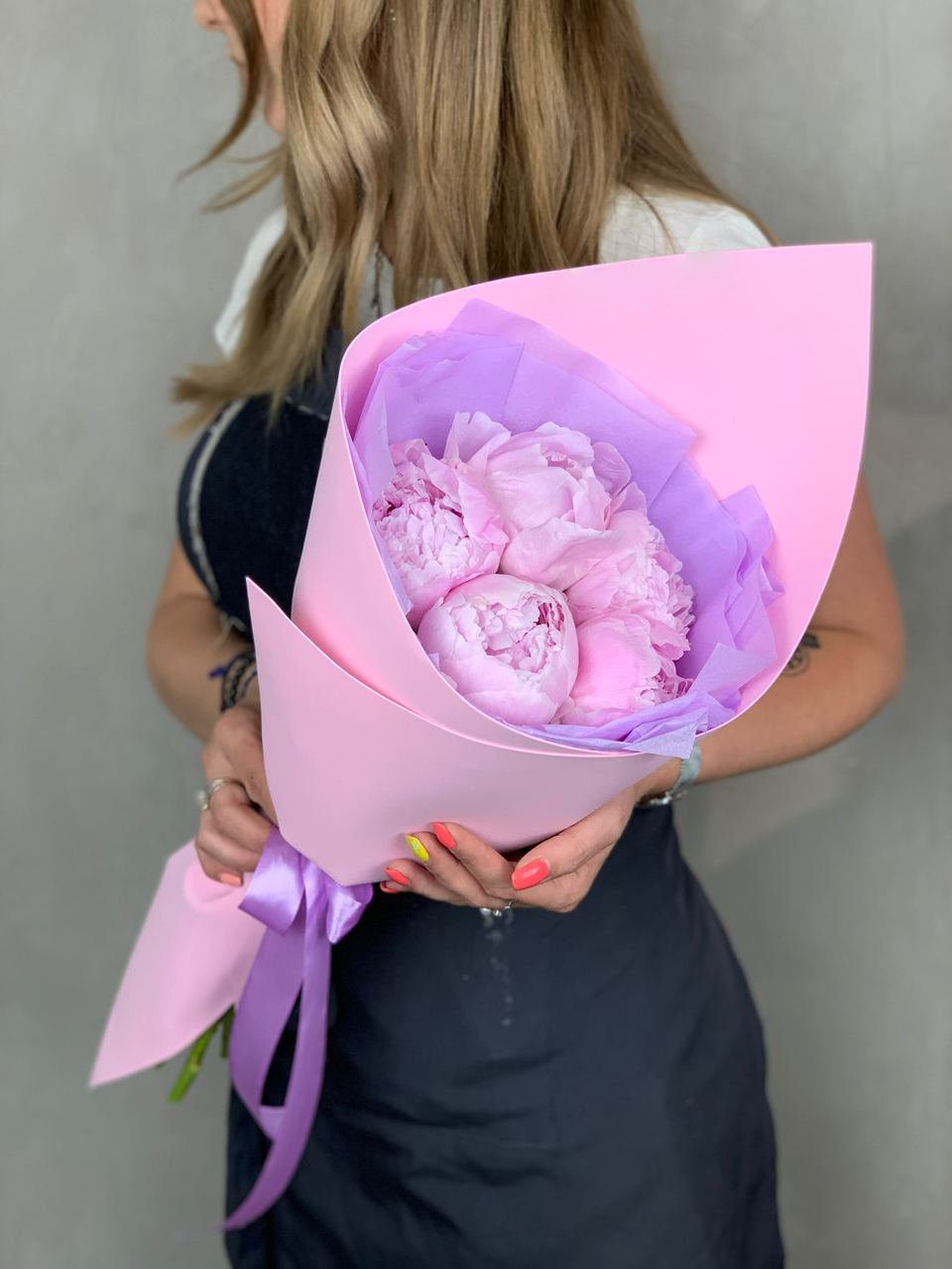 Розовые пионы в пудровой гамме дарят ощущение утреннего сада и свежести. Мягкая упаковка из тишью и фоамирана поддерживает воздушность композиции, сохраняя её лёгкость и естественность.