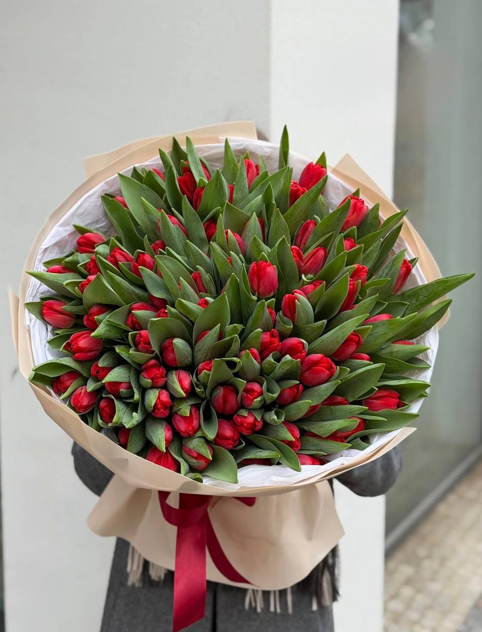 Пятьдесят один белоснежный тюльпан собран в плотный монохромный букет с мягкими соцветиями лагуруса. Чистая графика весенних бутонов создает ощущение свежести и простора.