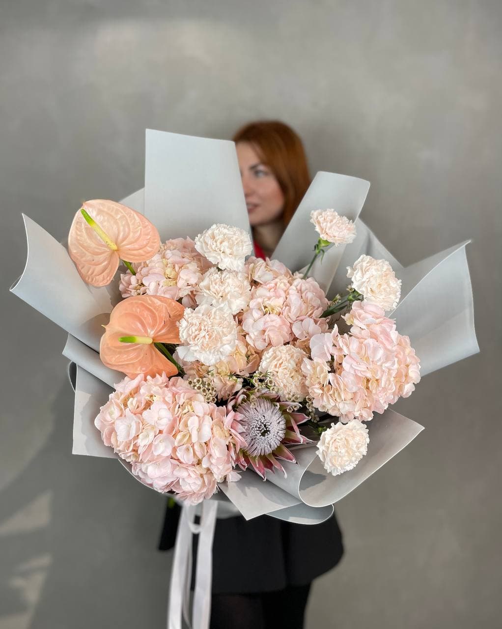 Протея задаёт графичный центр композиции, вокруг которого раскрываются пышные шапки гортензий и плотные бутоны роз. Хамелациум и бомбастик создают воздушную текстуру по краям, а эвкалипт добавляет серебристые штрихи между крупными соцветиями.
