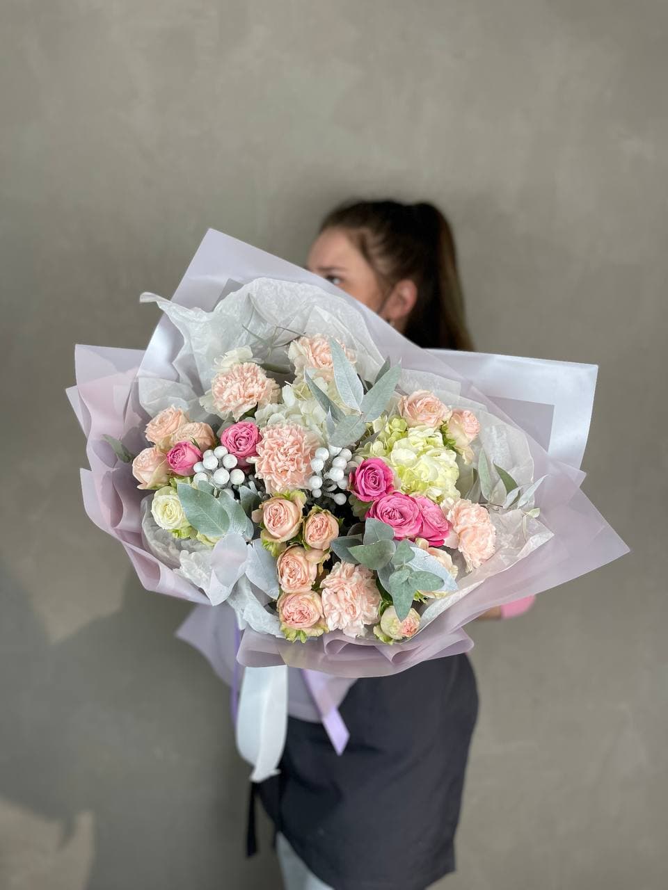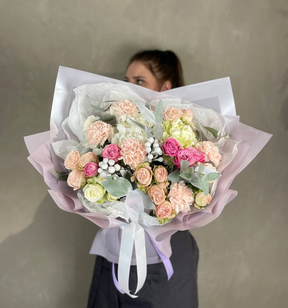 композиция из гортензий, протеи, хамелациума, роз, эвкалипта, бомбастика, диантусов в авторском оформлении.