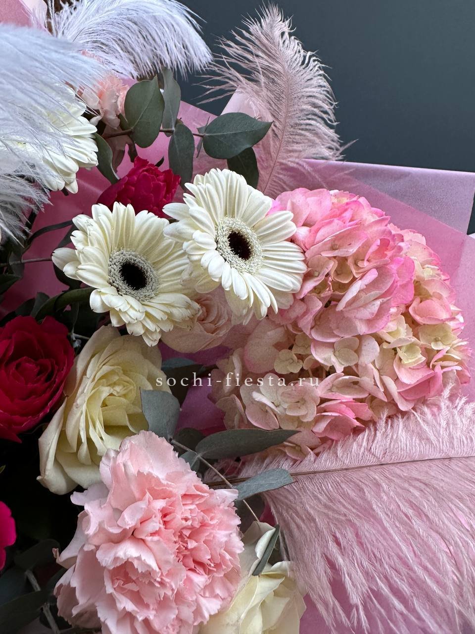 гортензии, роза одноголовая, роза кустовая, гербера, озотамнус, диантус, эвкалипт, декоративные перья, лента, дизайнерская упаковка.
