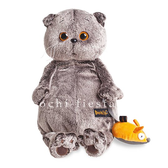 Серый плюшевый кот Басик с верным другом-мышонком в лапках. Бархатистая шерстка и характерная грустноватая мордочка создают узнаваемый образ любимого персонажа.