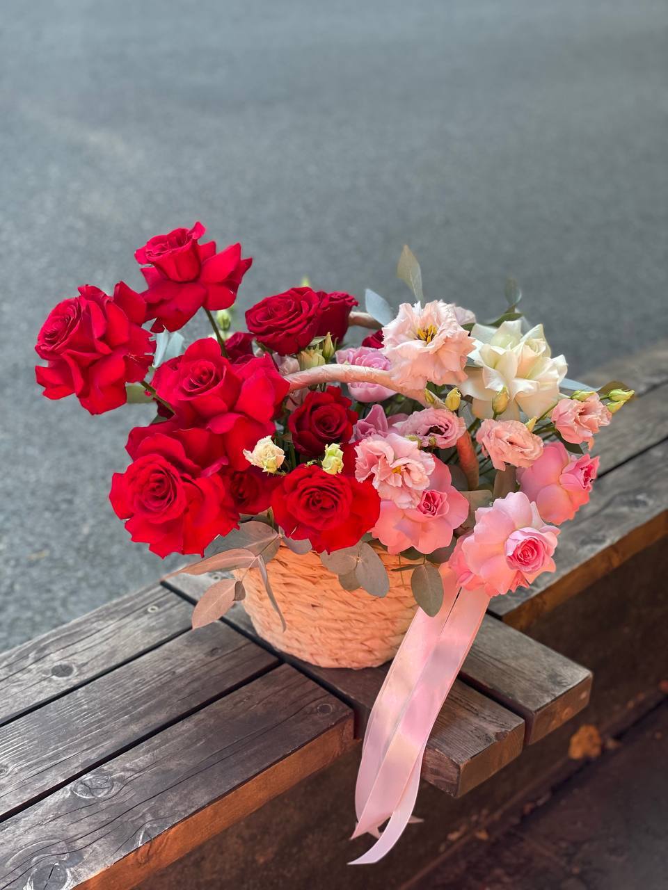 розовые розы, красная роза, эустома, эвкалипт, корзина малая.