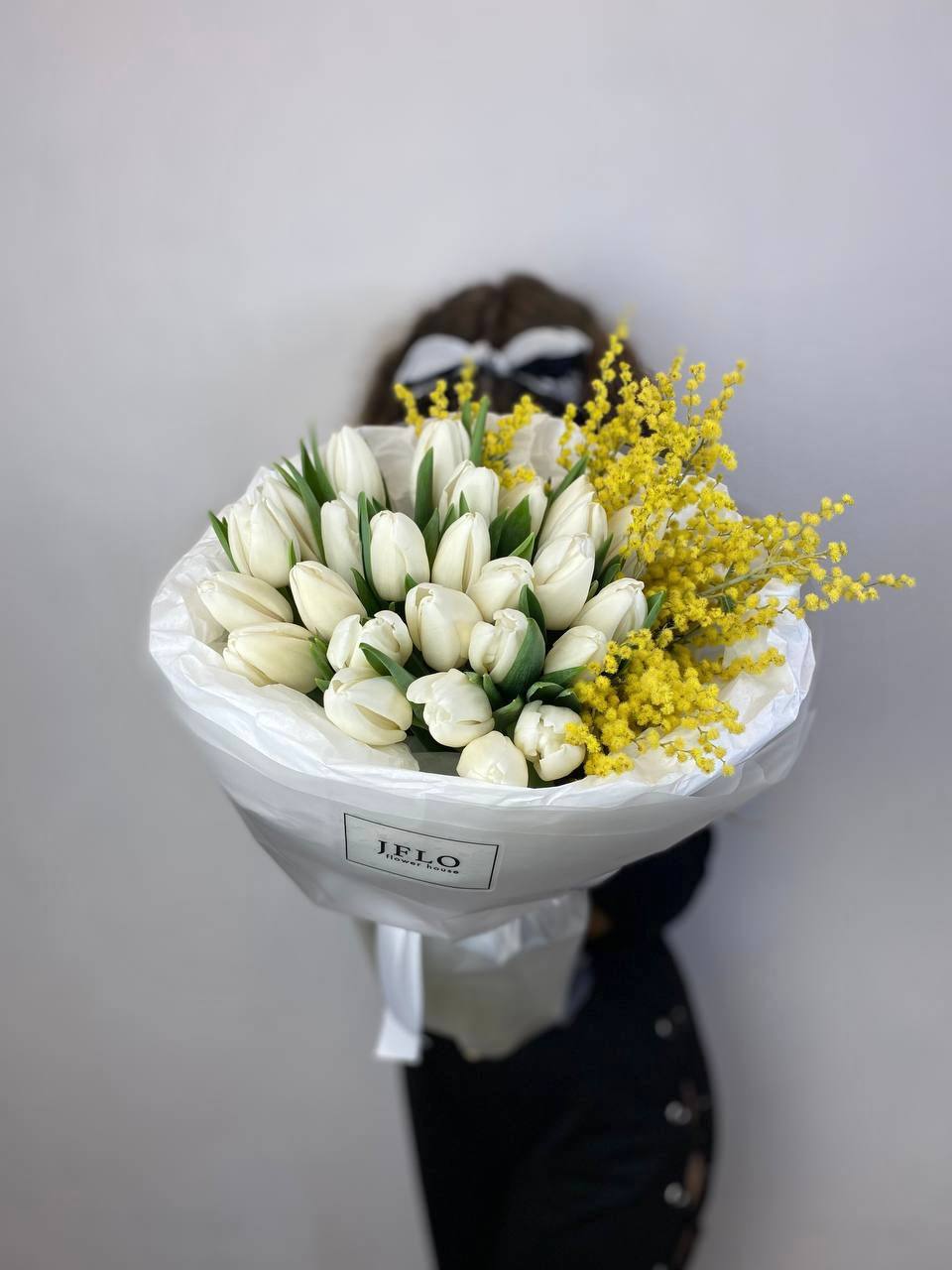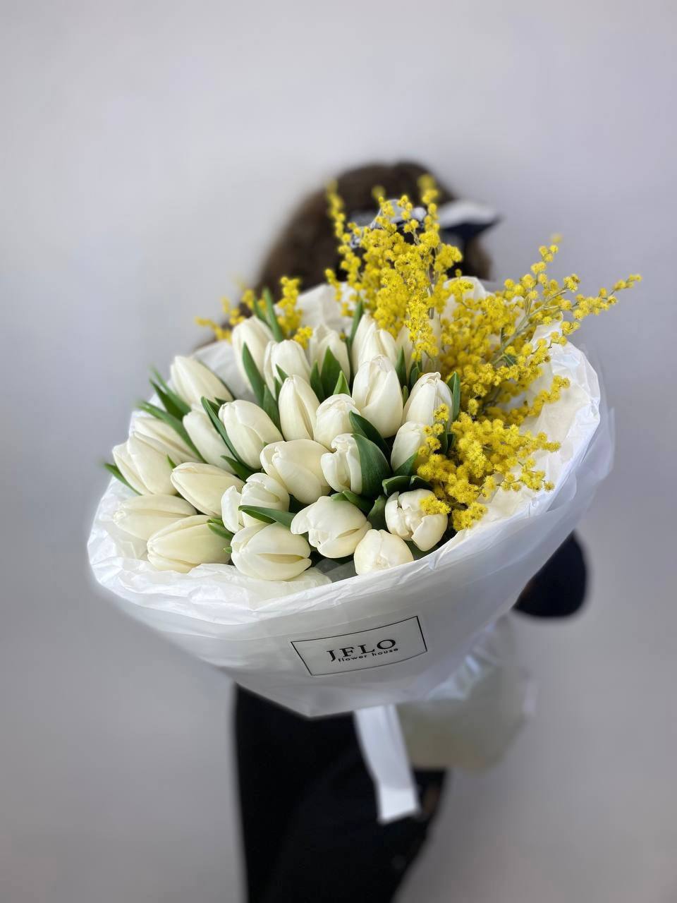 Белые бутоны и солнечные пушистые шарики собраны в плотную связку. Мимоза добавляет объём и весеннюю лёгкость строгим линиям тюльпанов. Букет держит форму и наполняет пространство свежестью.