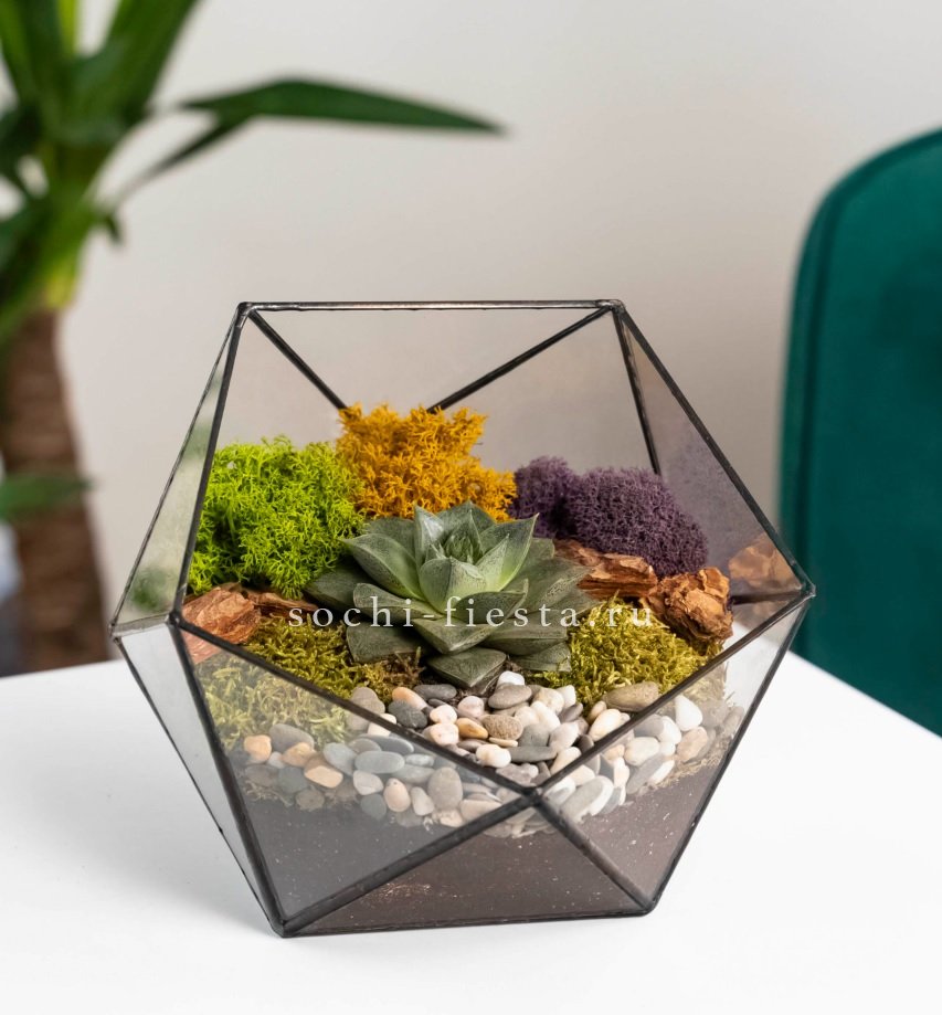 флорариум в кашпо Икосаэдр идеален для подарка искушенным и практичным личностям. Растение неприхотливо в уходе, композиция стильно смотрится в любом пространстве:)