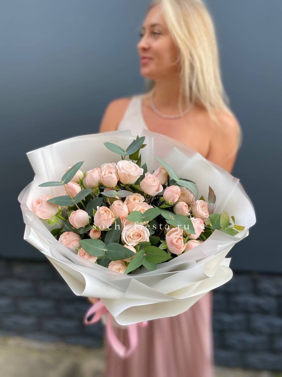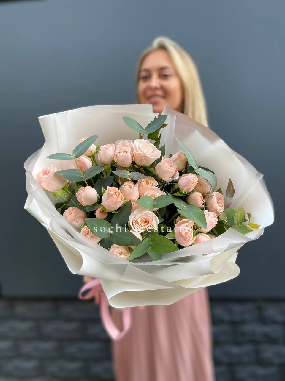 кустовые пионовидные розы Бомбастик, эвкалипт, цилиндр D13, бумага тишью, лента.