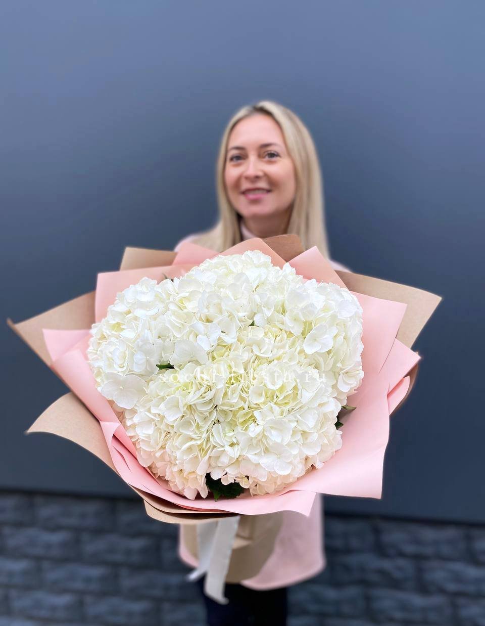 Семь белоснежных соцветий собраны в плотный объёмный силуэт. Гортензии Flakes создают ощущение летней свежести и спокойной гармонии. Монобукет для тех, кто ценит чистоту формы и природную красоту.
