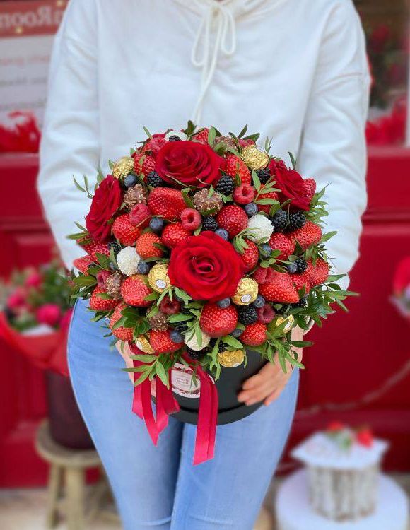 600-800г. ароматной клубники, 100г. тёмных ягод (голубика или ежевика), розы- 5 шт., конфеты Ferrero Rocher, бокс D16 (цвет бокса может быть согласован с клиентом), фисташка или эвкалипт.