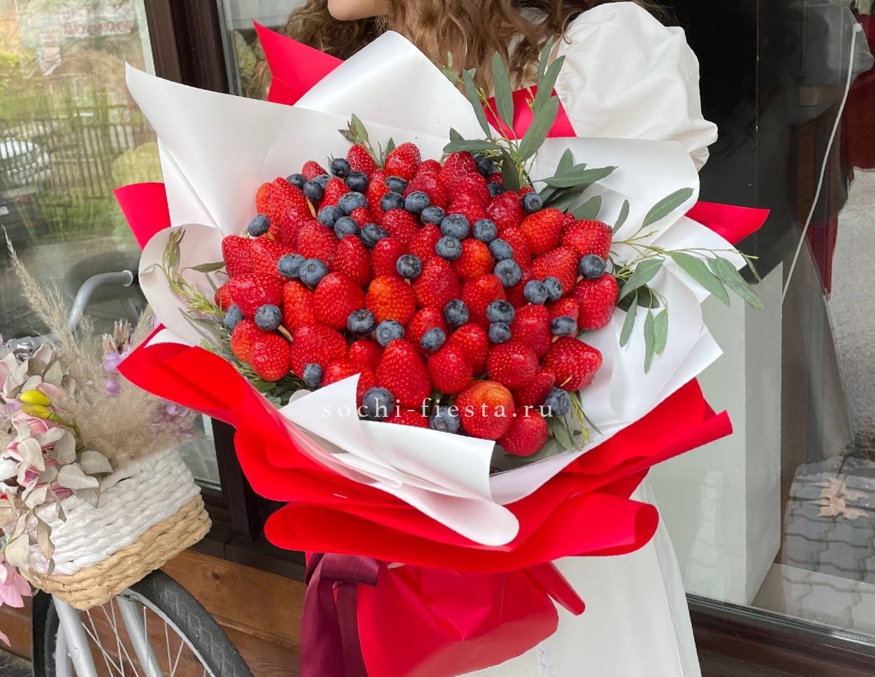 Алая клубника и синяя голубика собраны в объёмную композицию с мятой или эвкалиптом. Комбинированное оформление удерживает форму и позволяет разместить букет в любом пространстве.