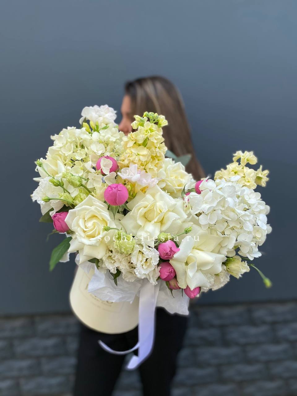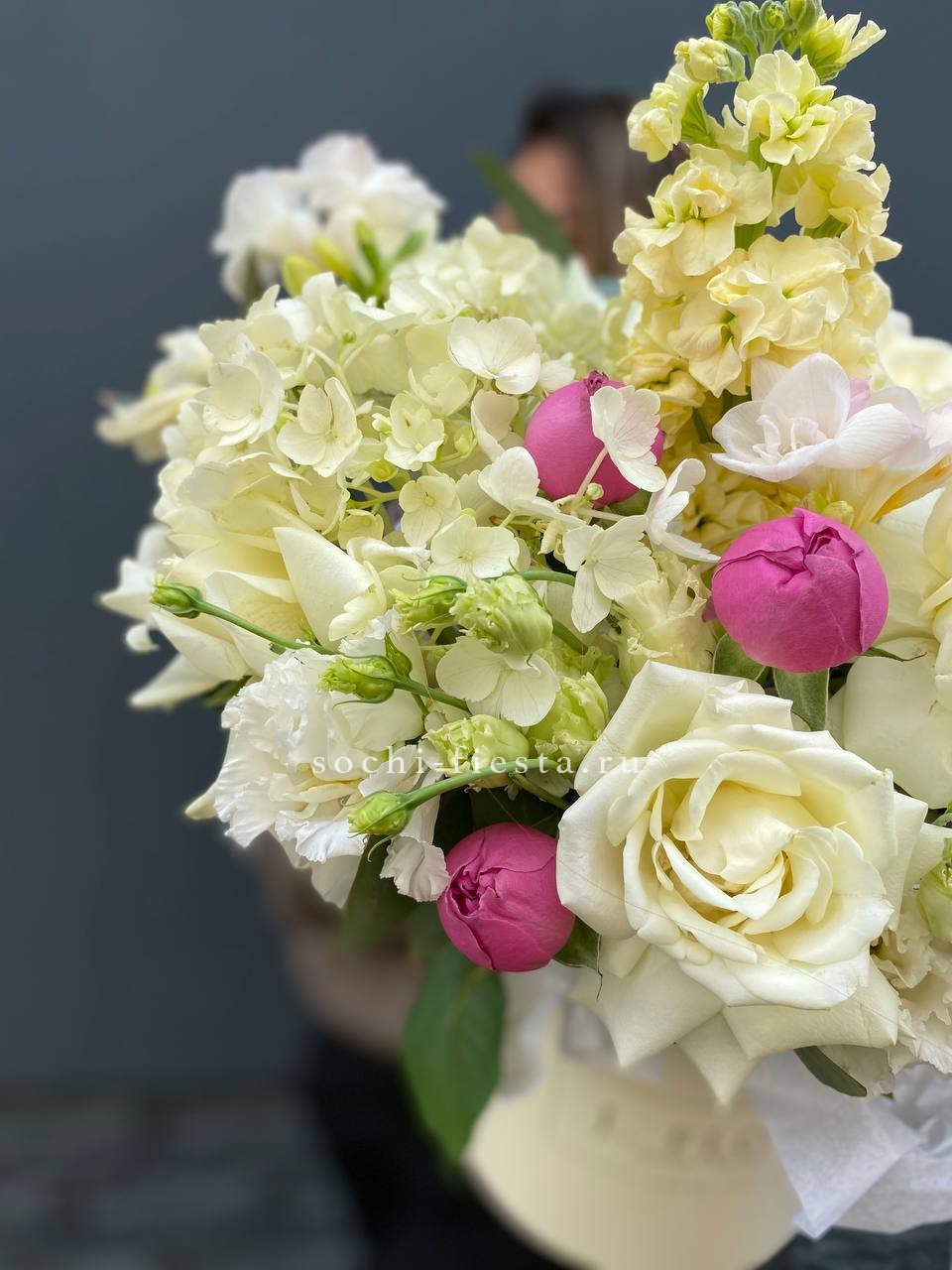 Белые французские розы раскрываются крупными бутонами и соседствуют с воздушной эустомой. Композиция создает ощущение легкости и света.