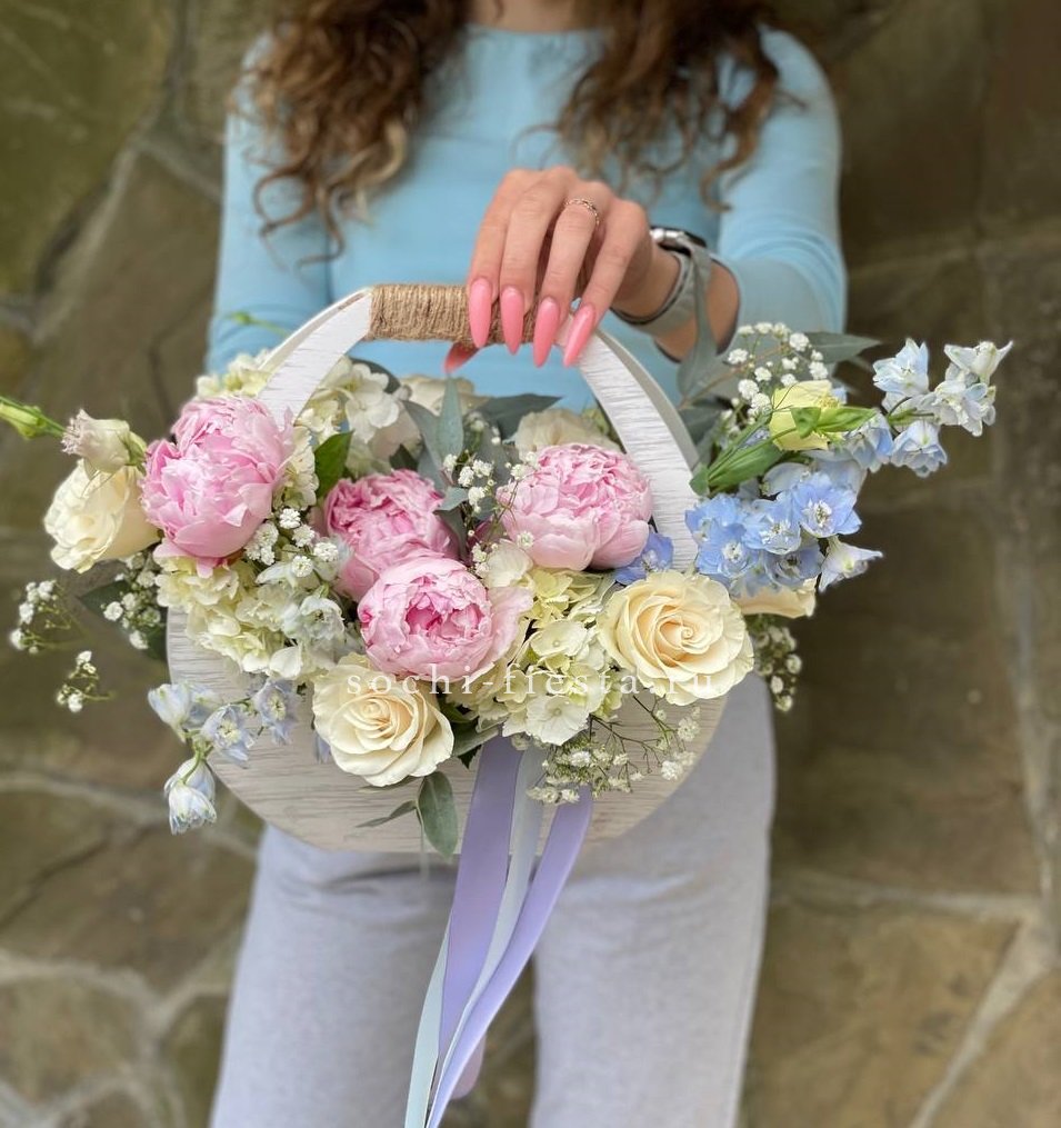 гортензия, пионы Сара Бернар, роза белая, гипсофила (замена вне сезона), дельфиниум (замена вне сезона), эвкалипт, деревянный ящик, лента.