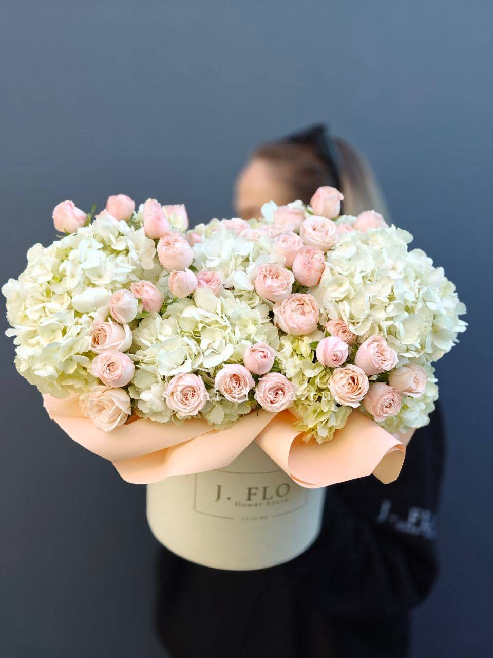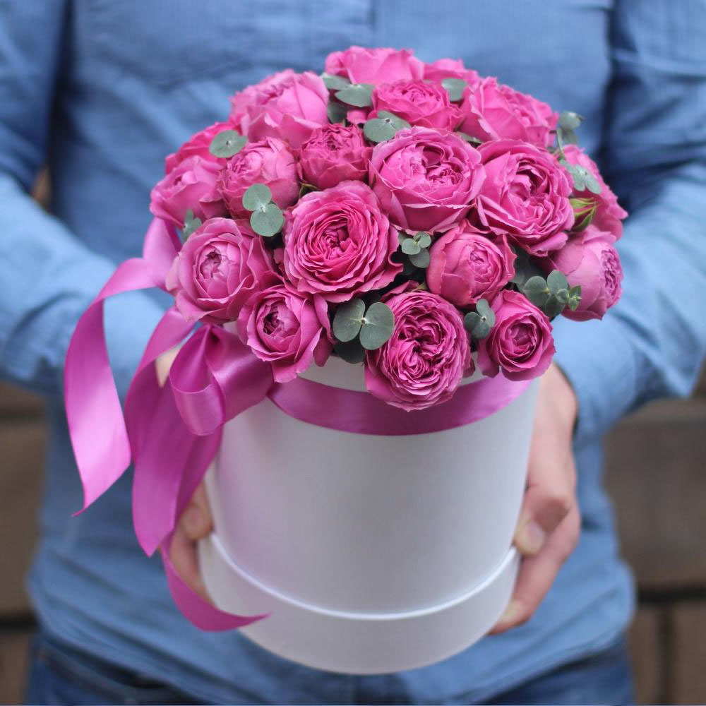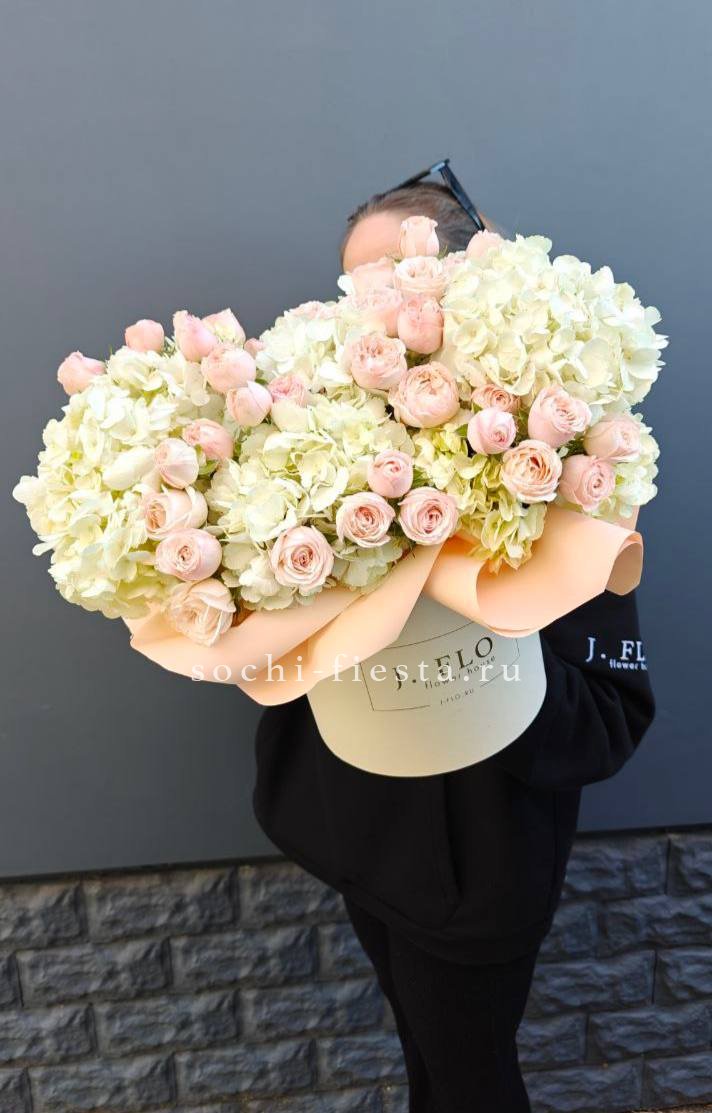 вывернутые белые розы, диантус, эустома, гортензия, цилиндр, эвкалипт, лента, упаковка.