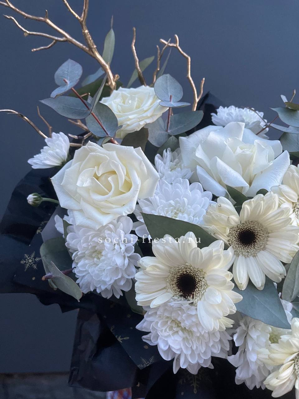 Герберы и хризантемы собраны в плотную шапку с белыми розами по краю. Композиция держит форму и выглядит графично благодаря чередованию крупных и мелких соцветий.