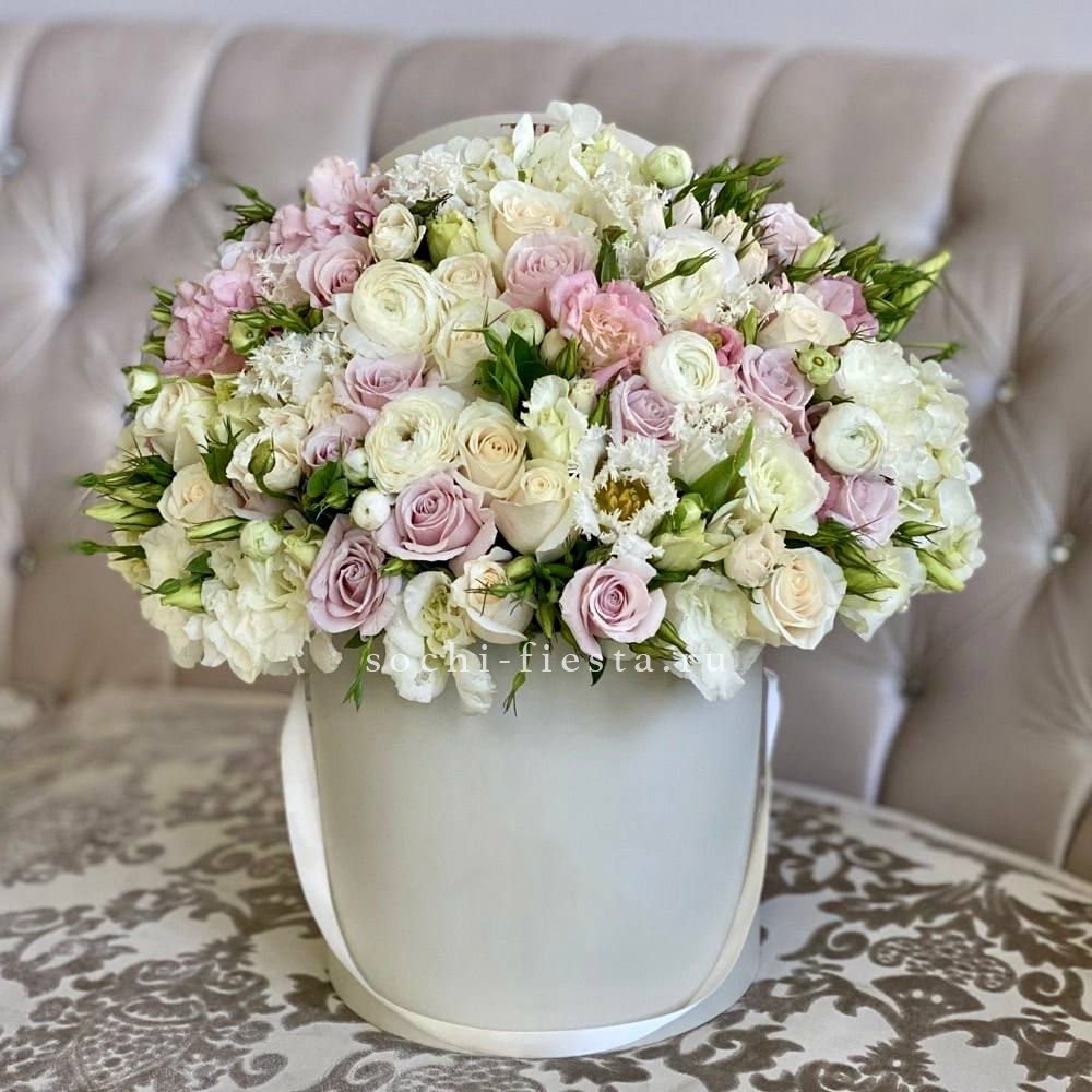 гортензия, розы пионовидные кустовые, эустома, эвкалипт, хамелациум, бруния, белая роза, цилиндр D16.