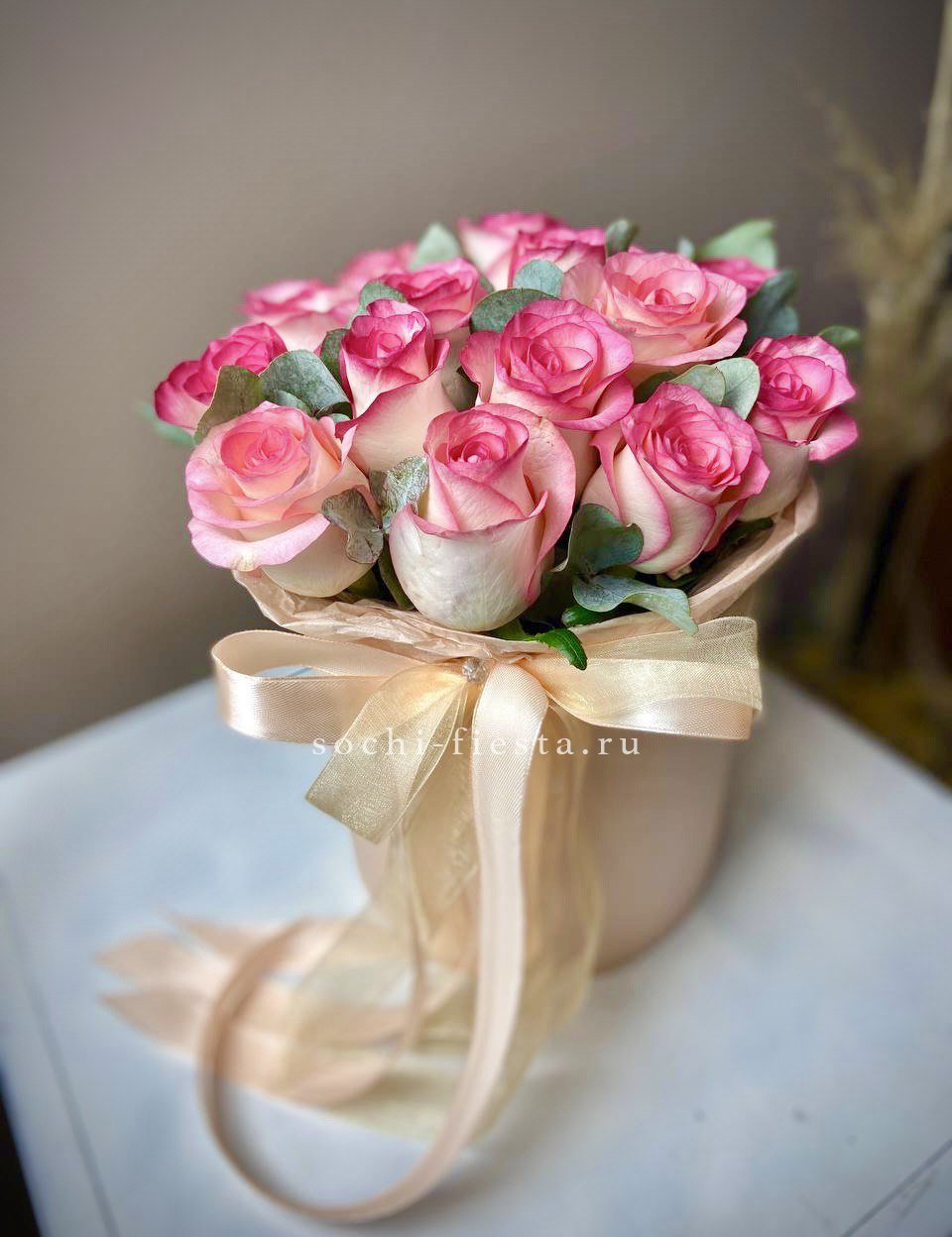 пионы, одноголовые розы, эустома, маттиола (аналог вне сезона), эвкалипт, мисти баблс, лента, цилиндр D20.