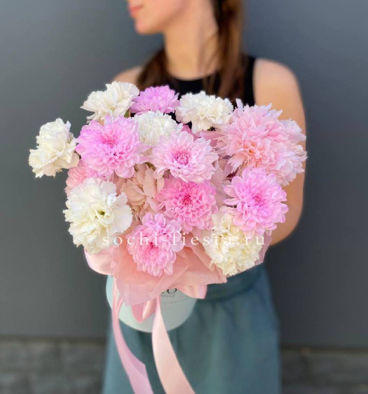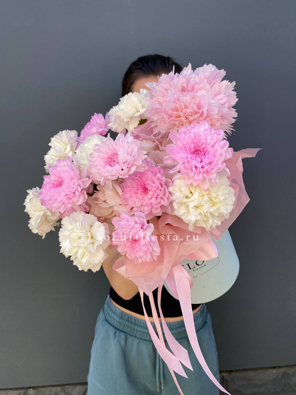 хризантемы, диантусы, пионы, цилиндр D13, эвкалипт, лента, тишью.