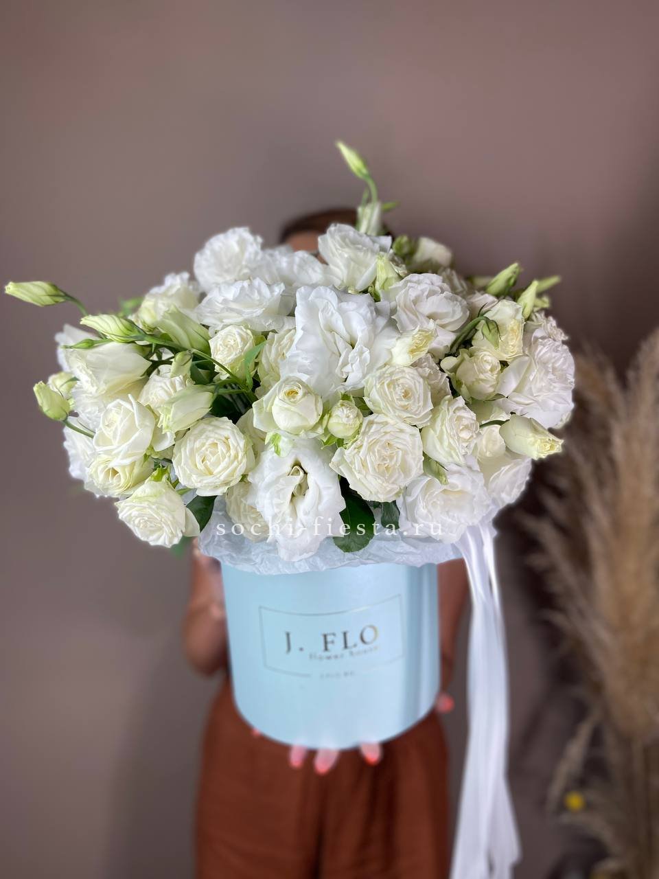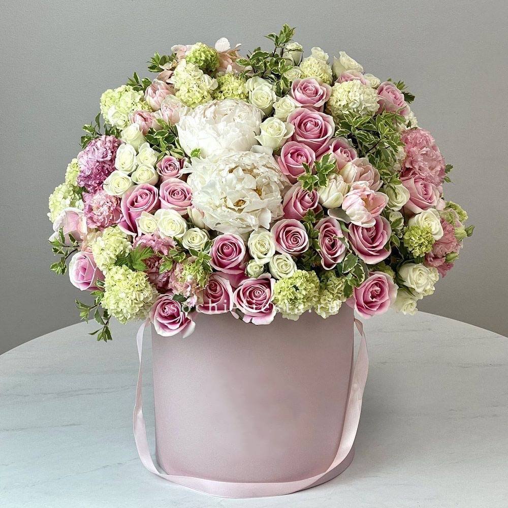 Пионовидные кустовые розы собраны плотно, создавая объёмную композицию с живой текстурой. Лимониум и эвкалипт добавляют воздушности, а цилиндр собирает всё в компактную форму.