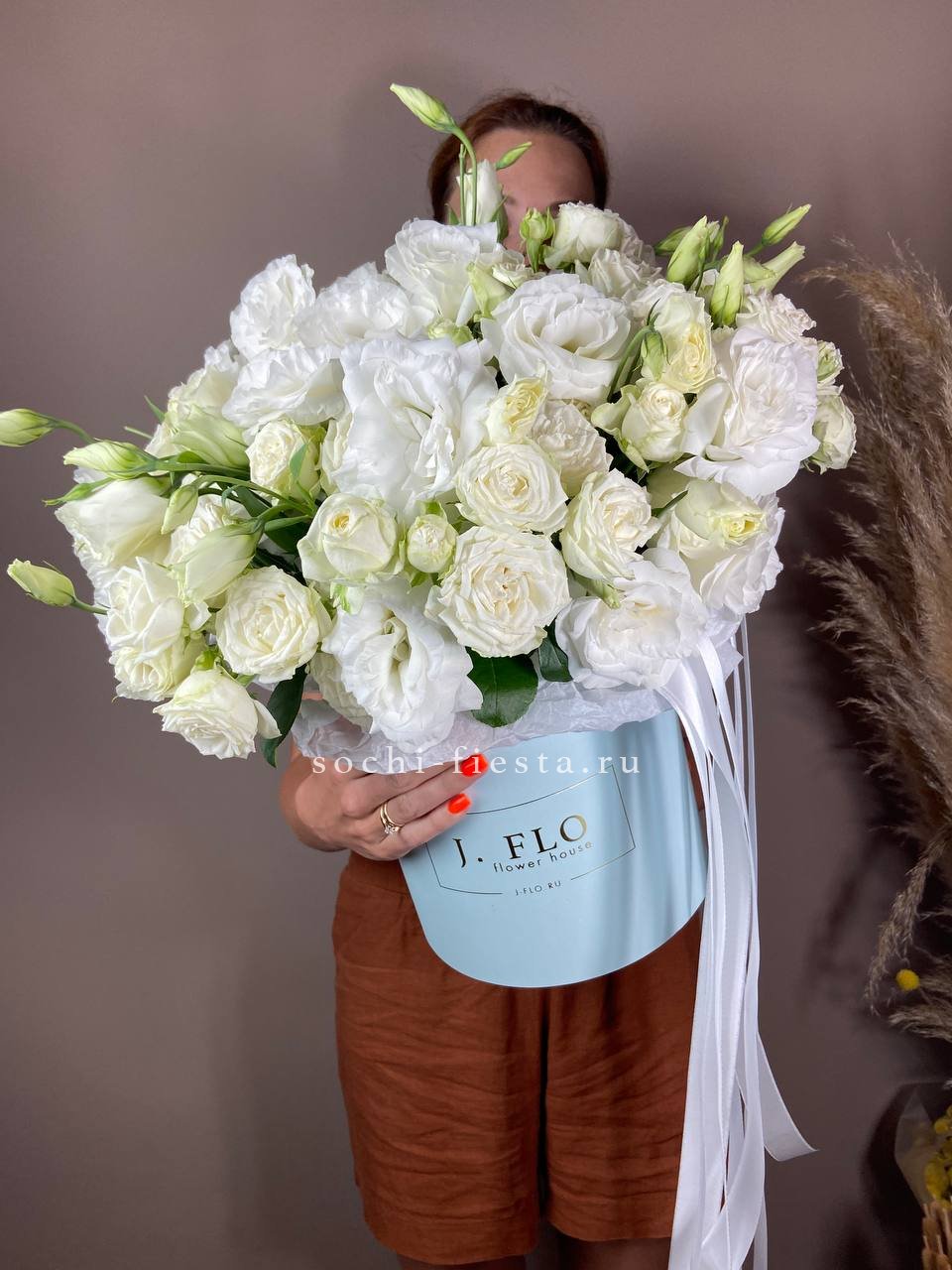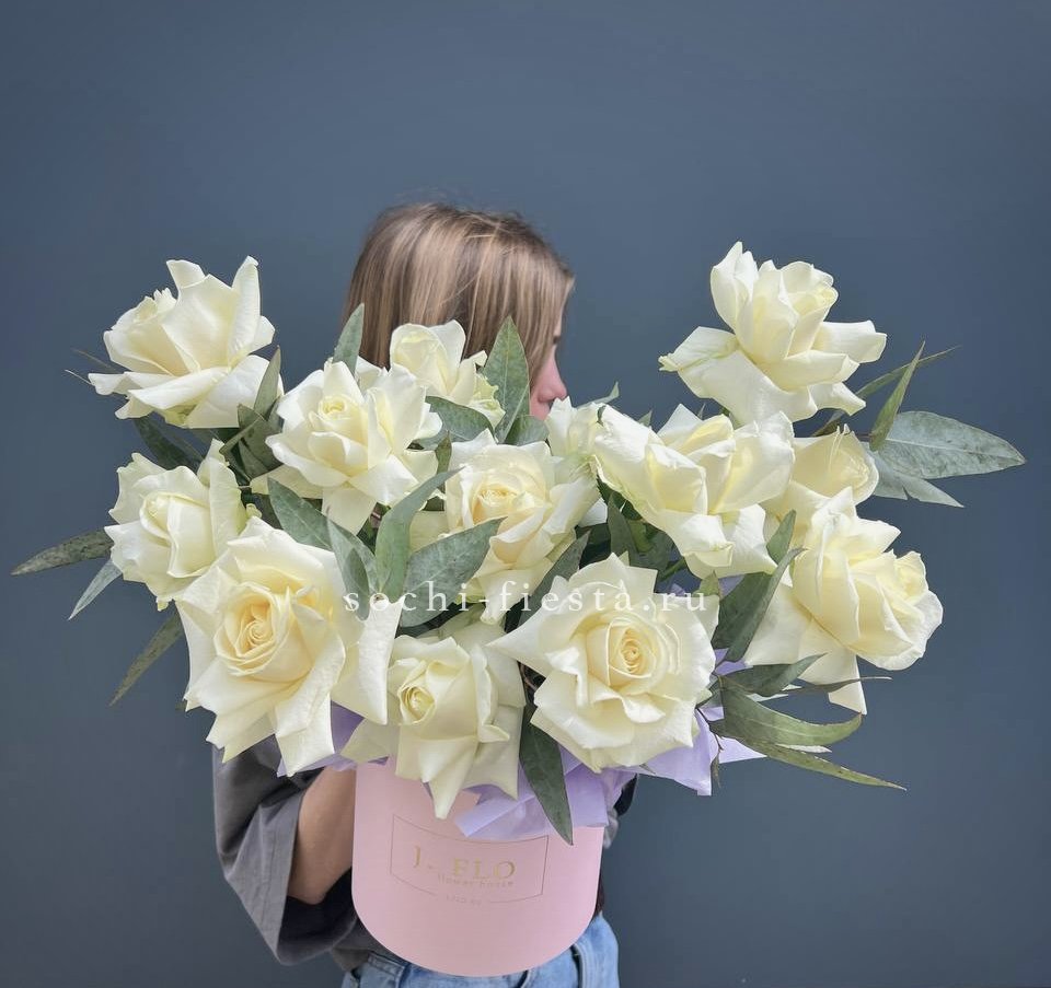 пионовидные кустовые розы, эвкалипт, лимониум, зелень, лента, цилиндр D16.