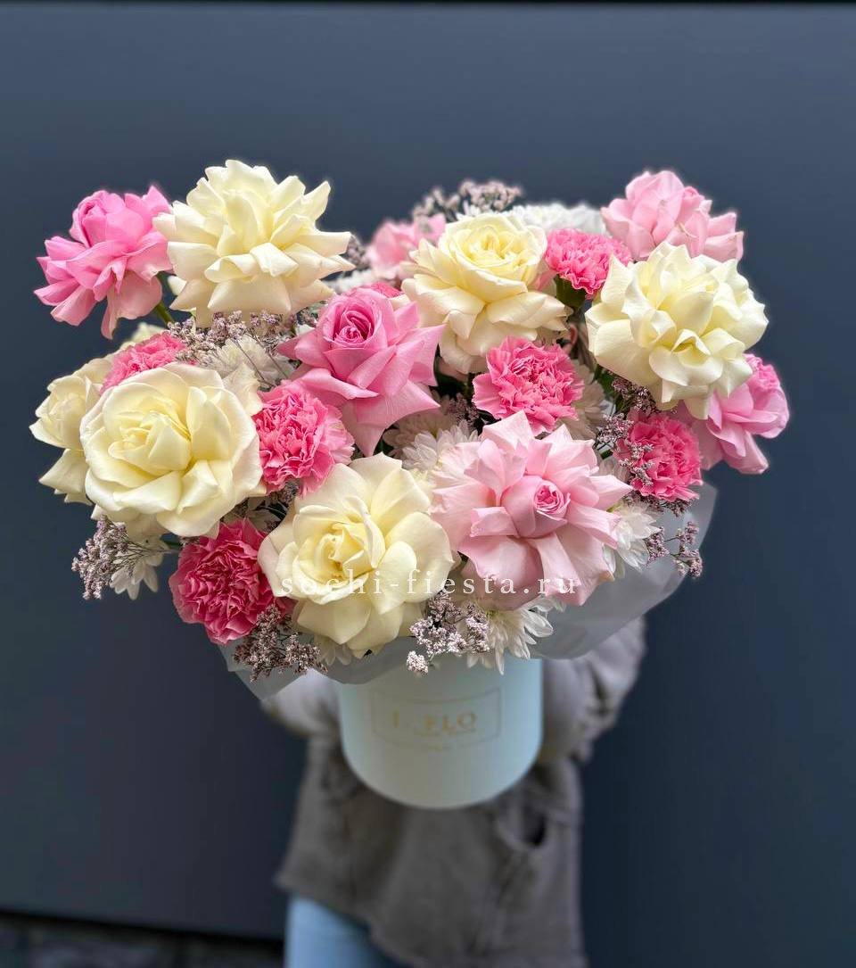 Пионовидные кустовые розы формируют плотный купол с мягкими переходами оттенков. Каждый бутон раскрывается слоями, создавая объёмную текстуру. Эвкалипт добавляет свежести композиции в цилиндре.