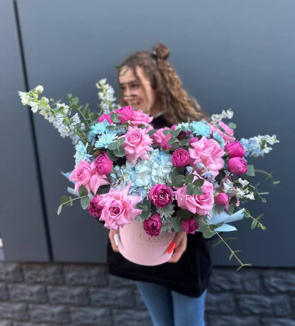 Розовая палитра переходит от французских роз к кустовым Джульетта с добавлением хлопка. Композиция в цилиндре сочетает воздушность и плотность фактур.