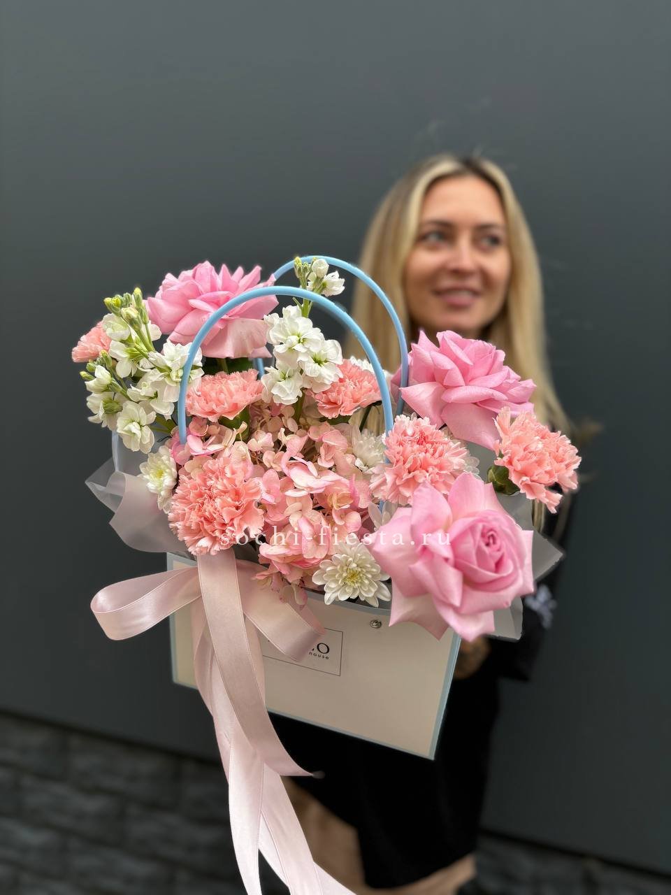 розовая роза, пионовидная роза, диантус, гортензия, эвкалипт, лента, сумка-кашпо.