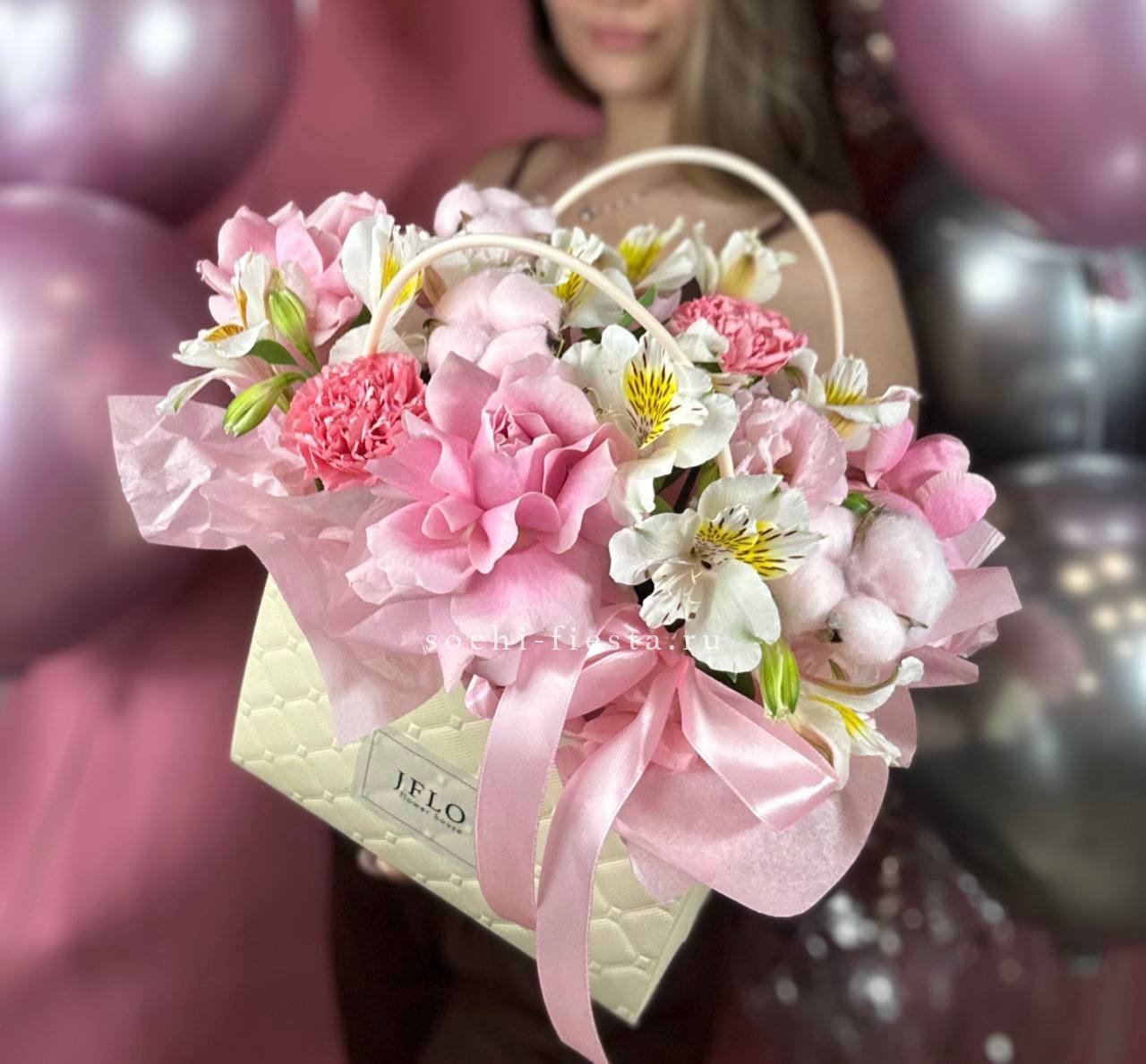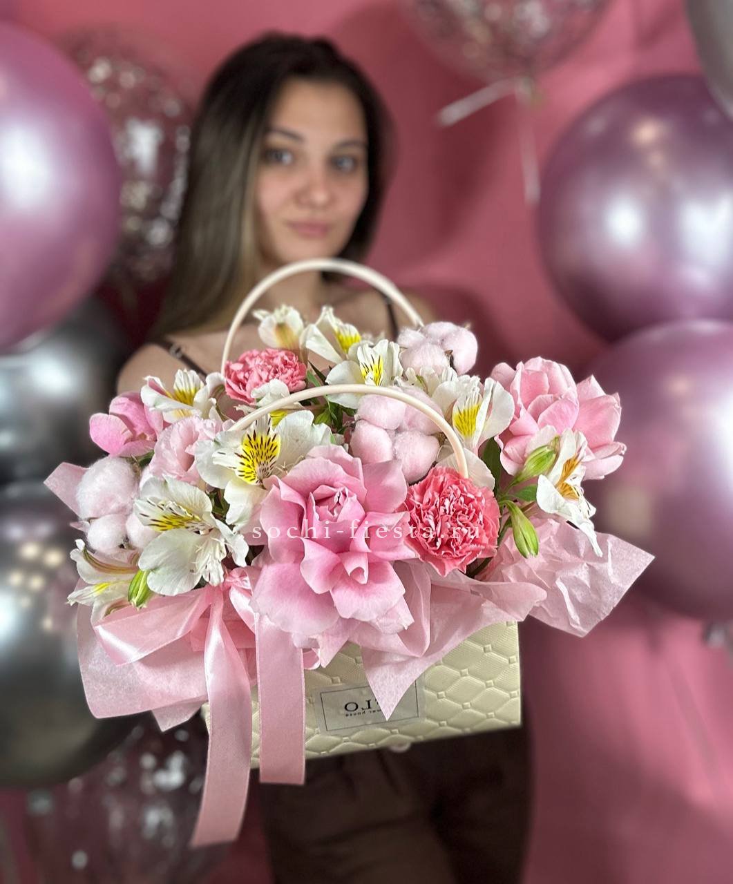 Эустома и кустовые хризантемы в сумке-кашпо образуют пышную многослойную композицию. Плотные бутоны и открытые цветки создают живую фактуру и объем.