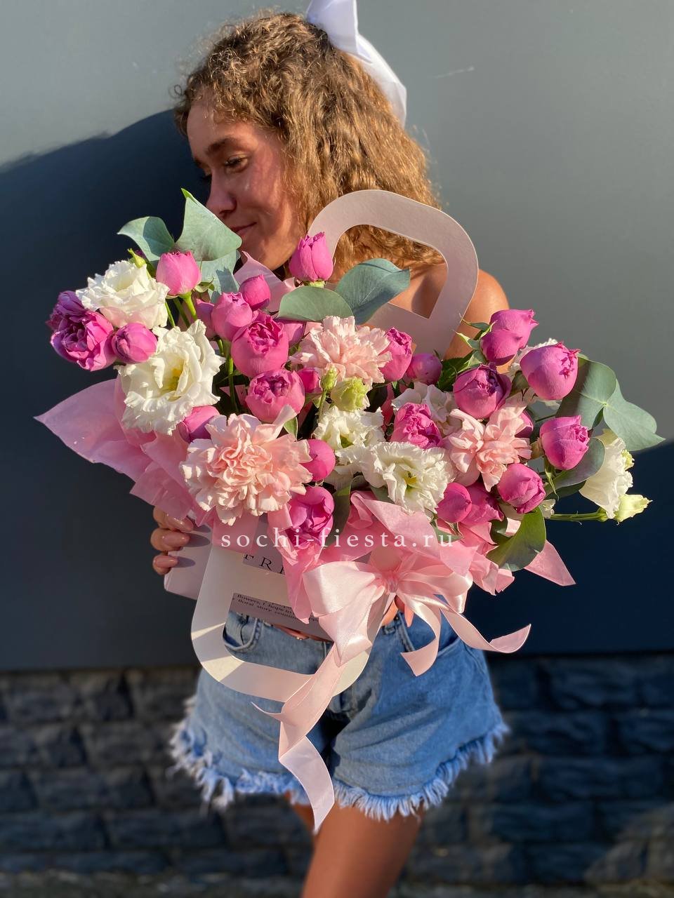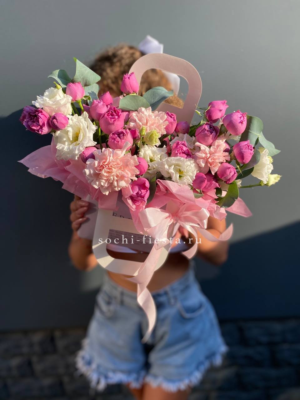 пионы, хризантемы,кустовые розы,лагурус, лента, сумка-кашпо.