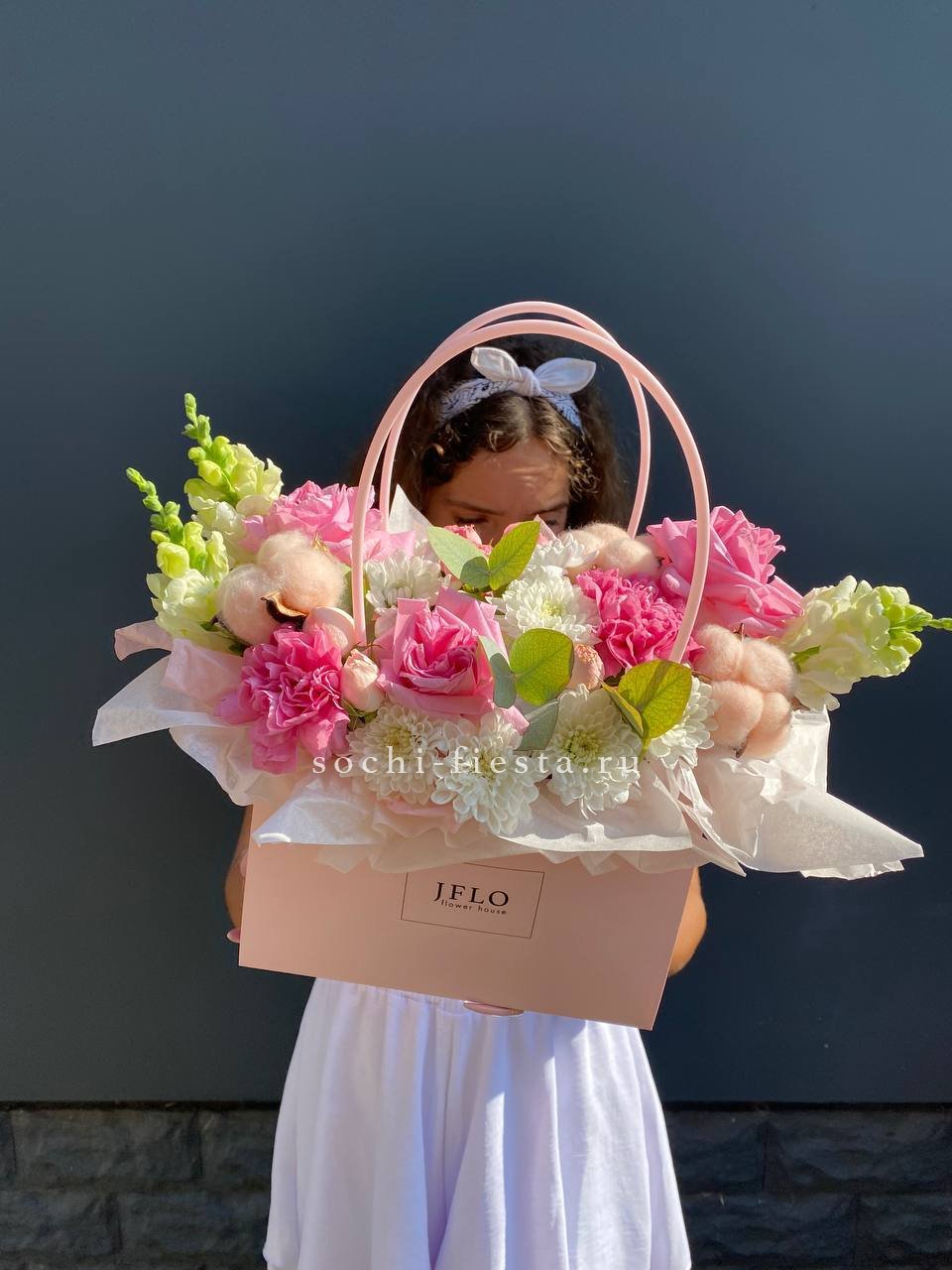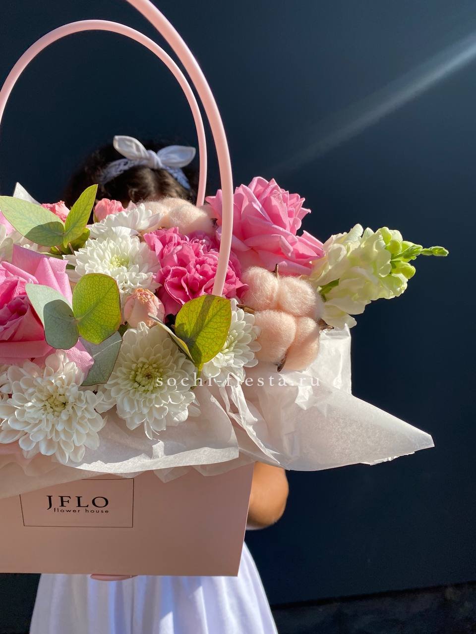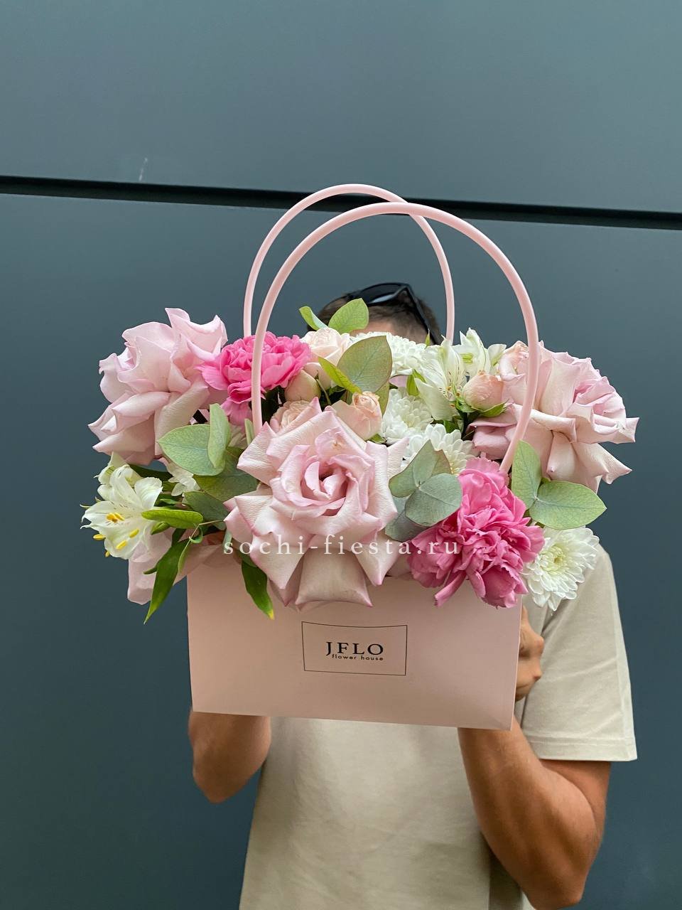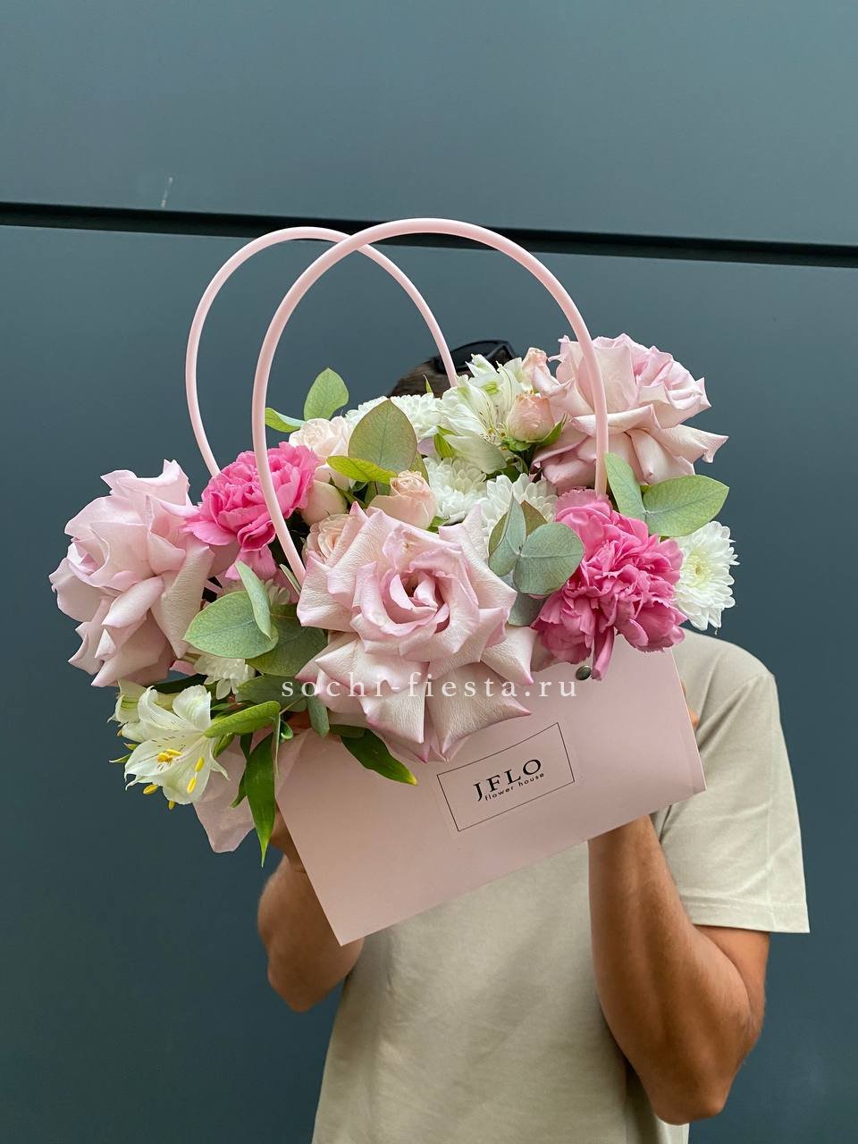 Белоснежные розы переплетаются с воздушной эустомой и раскрытыми лилиями в аккуратной цветочной сумке. Эвкалипт создаёт прохладный фон для светлых бутонов. Композиция на оазисе сохраняет свежесть и форму долгое время.