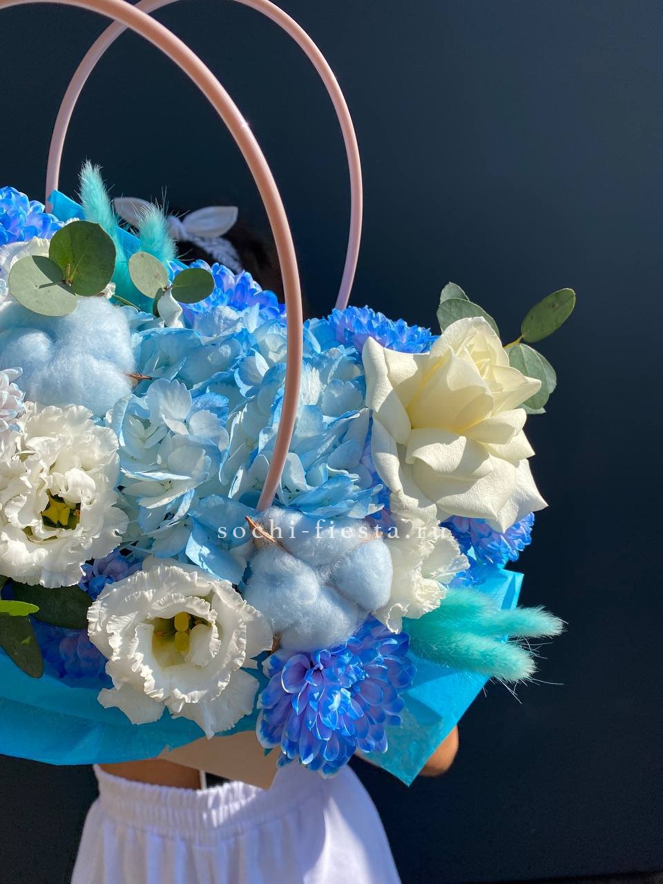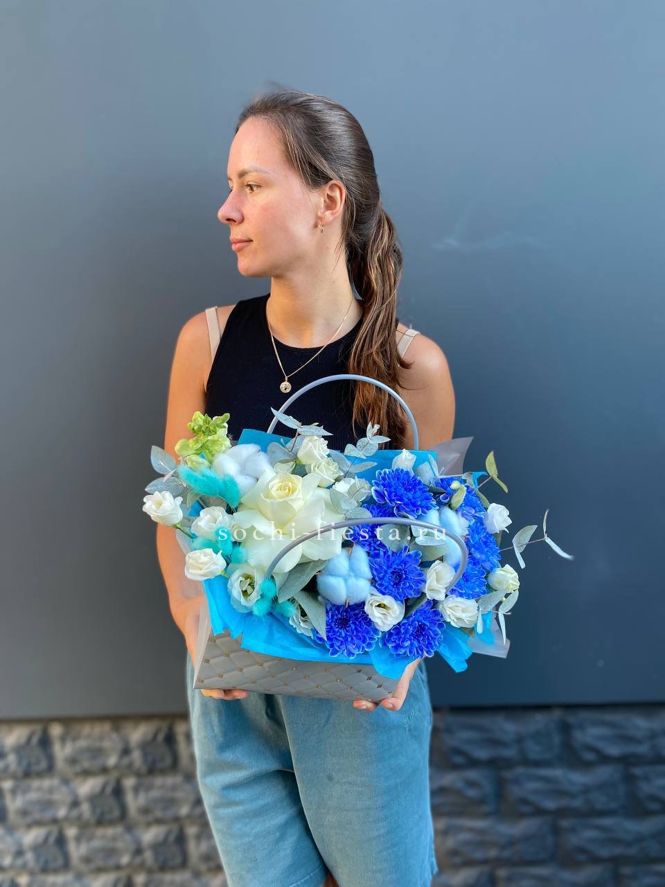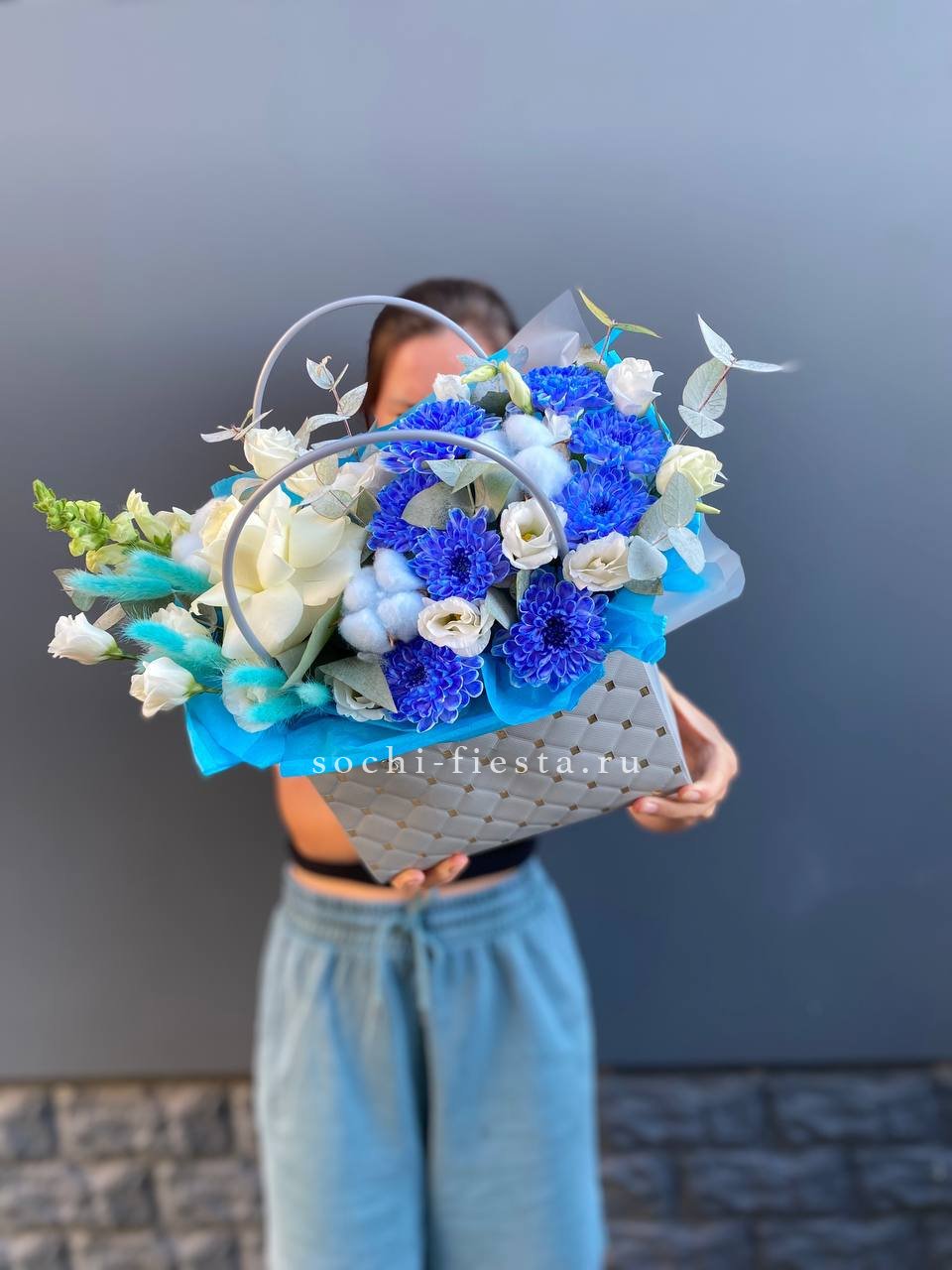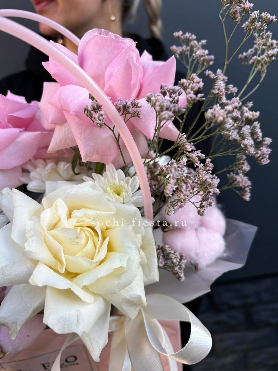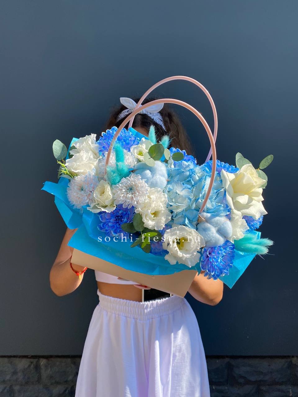 Гортензия и джумилия соседствуют с герберой в удобной сумочке. Разная плотность бутонов создает живую игру объемов и переходов от воздушного к плотному.