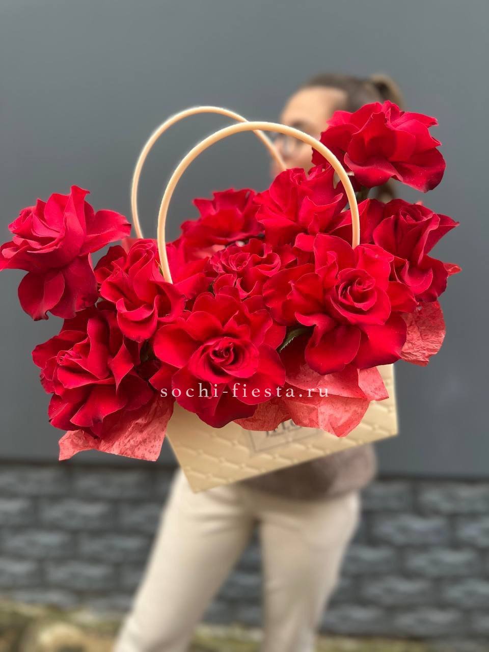Яркая композиция в удобной сумочке объединяет розы Джумилия с герберами и воздушными соцветиями. Хлопок и лагурус добавляют природной легкости, а диантус создает цветовую динамику.