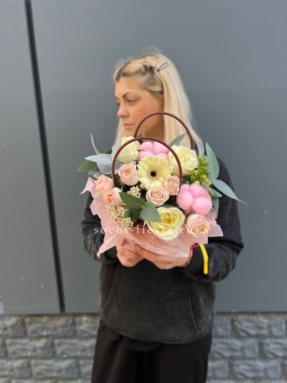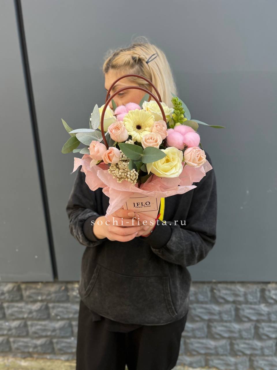 джумилия, гербера, мисти баблс, диантус, хлопок, лагурус, сумочка.